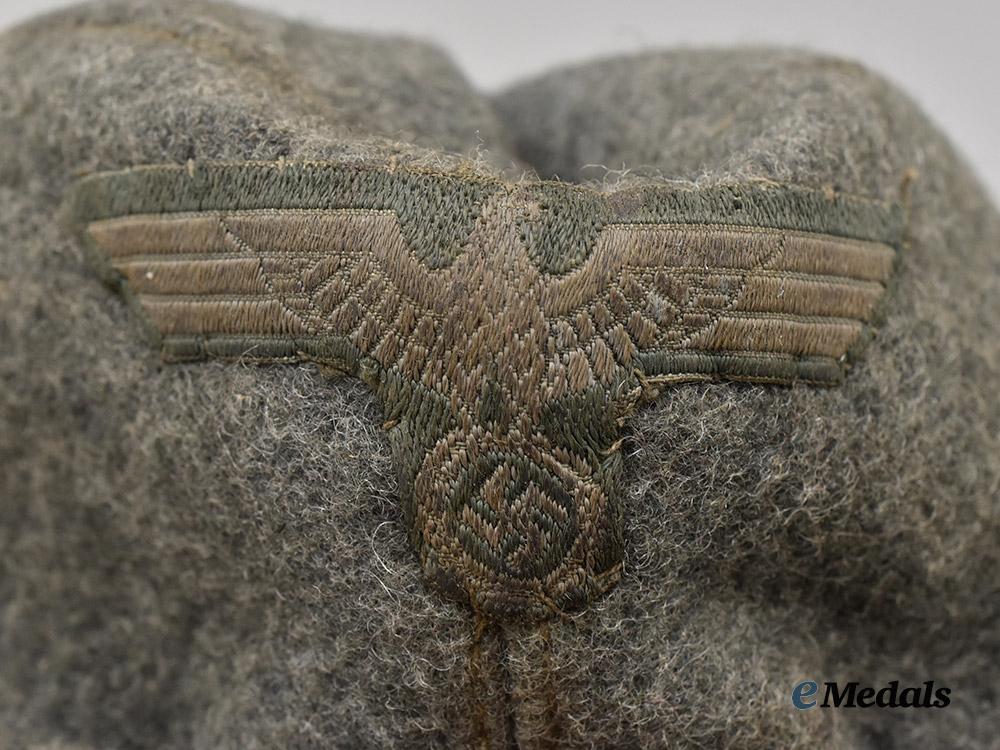 (Heer Schiffchen M35 für Mannschaften). A very well-preserved Heer EM/NCO’s M35 overseas cap, constructed of field-grey wool. The cap is fully surrounded by fold-down side walls which gently scallop toward the front. The crown is flanked on each side by ventilation holes reinforced with non-magnetic metal grommets. Stitched onto the peak is an insignia consisting of a field-grey rayon backer bearing a machine-embroidered silver-grey Wehrmacht eagle clutching a wreathed mobile swastika, measuring 65 mm (w) x 25 mm (h). Directly below the eagle, the front also features an insignia in the form of a field-grey rayon backer bearing a machine-embroidered tri-colour cockade, measuring 35 mm (w) 35 mm (h). A multi-piece olive-drab cotton liner encompasses the interior, with the partially-legible stamp of a Vienna manufacturer visible on the crown, in addition to a size mark of “59”. The cap measures approximately 28 cm (l) x 12 cm (h) when folded on a flat surface. Minor soiling and material fatigue consistent with age and wear is visible to both the interior and exterior, but this field-worn cap remains in a near extremely fine condition.