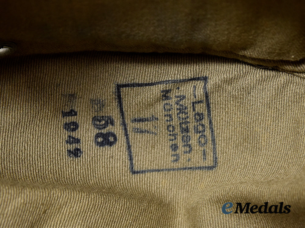 (Heer Schiffchen M42). A well-preserved Heer EM/NCO’s M42 overseas cap, constructed of field-grey wool. The cap is fully surrounded by fold-down side panels, scalloped toward the front, which provide optional ear and neck protection to the wearer. When not in use, the walls roll up and are secured in place at the front with two pebbled magnetic metal buttons which emanate from the right flap and meet an equal number of reinforced buttonholes on the left flap. The crown is flanked by ventilation holes which are reinforced with zink grommets. Stitched onto the peak is an insignia consisting of a field-grey rayon backer bearing a machine-embroidered silver-grey Wehrmacht eagle clutching a wreathed mobile swastika, situated above a tri-colour cockade, measuring 50 mm (w) x 40 mm (h) overall. The interior is fully encompassed by a multi-piece olive-drab cotton twill liner. Stamped onto the crown is a maker’s mark of “LAGO MÜTZEN MÜNCHEN”, indicating production by a member of a Munich manufacturing collective, with a size mark of “58”, and a date of “1942”. It measures approximately 29.5 cm (w) x 10 cm (h) when folded on a flat surface. Demonstrating only minor material fatigue (including a small patch of mothing to the right wall), it remains in a near extremely fine condition.