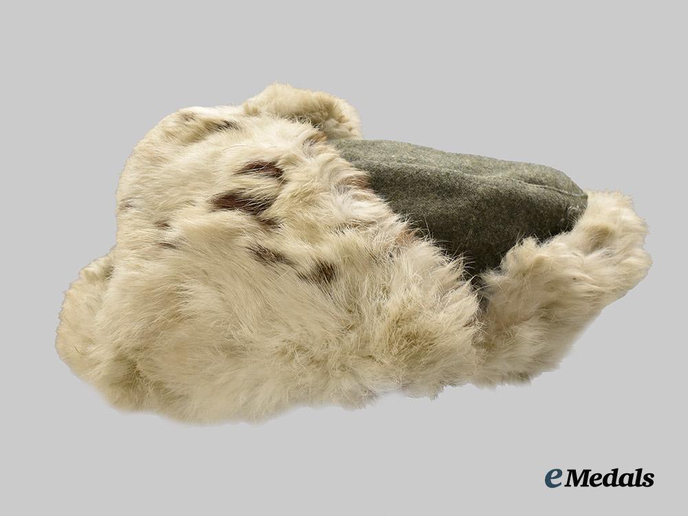 (Heer Pelzmütze für Mannschaften). A well-preserved Heer Enlisted personnel winter field cap, constructed of a field-grey wool shell. The cap is fully surrounded by fold-down walls consisting of a padded grey rayon base lined on the exterior with fine rabbit fur. The walls feature ear pieces which, when not in use to mitigate inclement weather conditions, roll up and tie together above the crown with a two-piece field-grey drawstring. Pinned onto the peak is an insignia consisting of a silvered zink Wehrmacht eagle clutching a wreathed mobile swastika, measuring 70 mm (w) x 30 mm (h) and retaining all three of its original attachment prongs. The interior is fully encompassed by a padded multi-piece grey rayon liner. A size mark of “56” is stamped onto the crown, and topped by an illegible Reichsbetriebsnummer (RBNr.). Measuring 25 cm in diameter, this high-quality cap demonstrates only minor and age-appropriate material fatigue and soiling (with some loss of finish to the eagle insignia), and remains in an extremely fine condition.