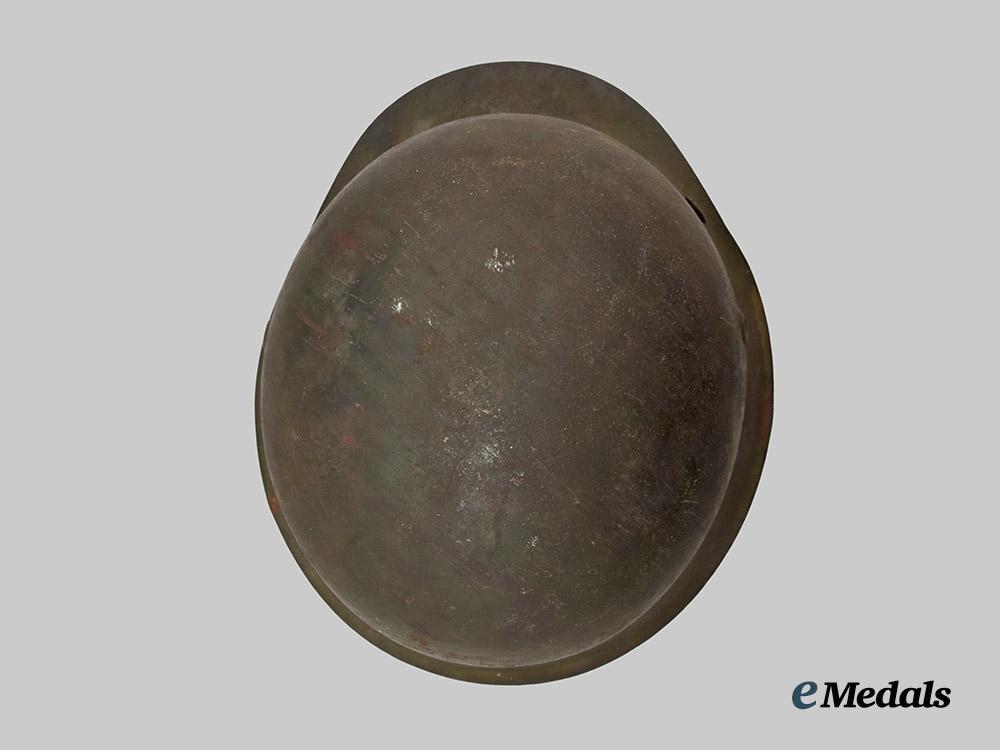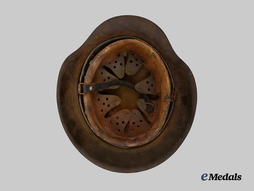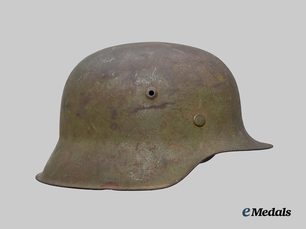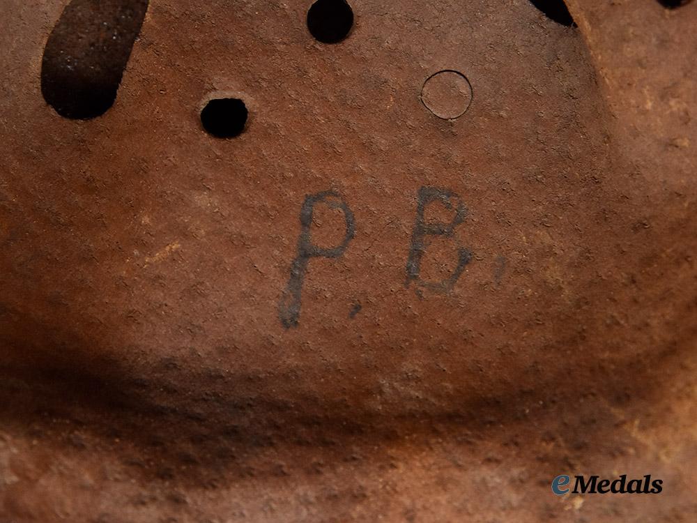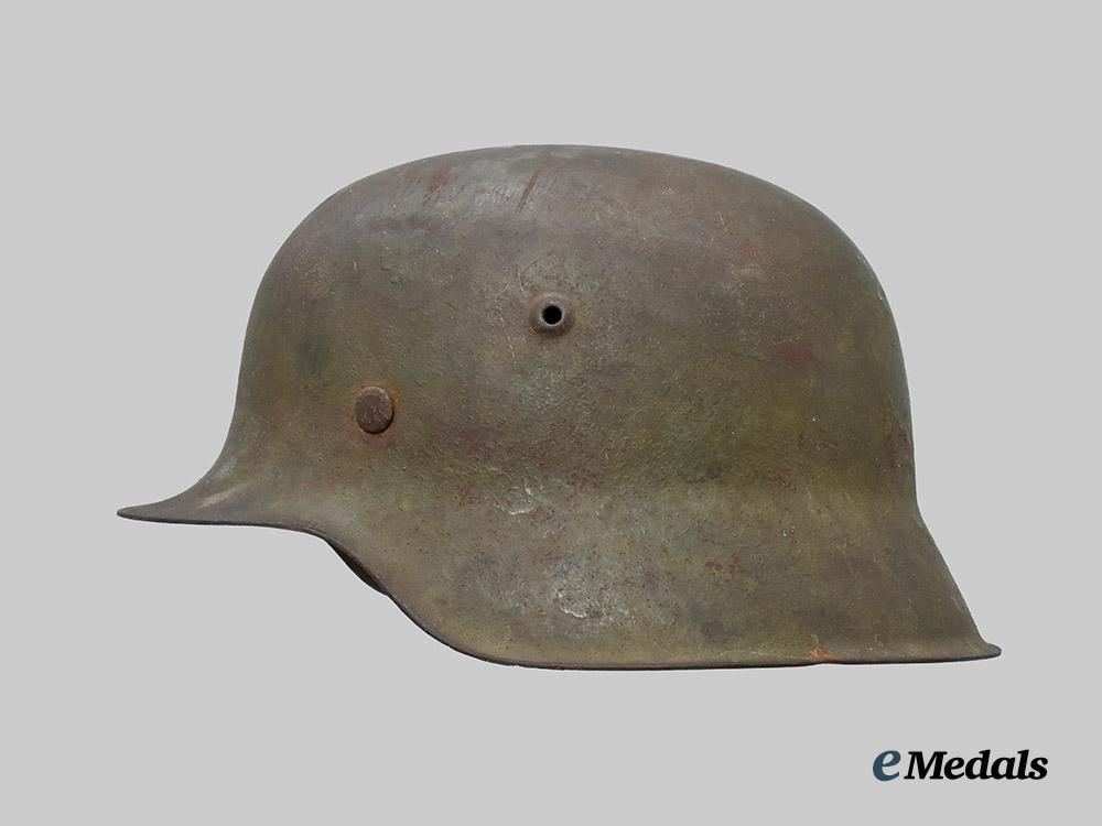 (Heer Stahlhelm M42). A Heer M42 Stahlhelm, constructed of a single sheet of magnetic molybdenum steel which retains much of its original apple-green paint. Three rivets are distributed around the outer circumference for the accommodation of the interior fixtures, while the crown is also flanked by dual ventilation holes. A flaring skirt culminates in an uncrimped rim in classic M4 style. The interior retains a zink ring, held in position by the shell rivets, which accommodates a brown leather liner featuring eight fingers, each perforated with five ventilation holes and topped by an additional eyelet for the accommodation of a drawstring which has been lost to time. Two magnetic metal loops emulate from the sides of the ring and retain a partially-intact black leather chinstrap. Stamped onto the reverse of the skirt is a maker’s code of “HKP” indicating manufacture by Sächsische Emaillier und Stanzwerke A.G., Lauter, with a shell size of “64” and a heat roll code of “3737”. Handwritten owner initials of “P.B.” are also visible on the liner. It measures approximately 24.5 cm (w) x 29 cm (l) x 14.5 cm (h). The Stahlhelm demonstrates issues consistent with age and field wear, include minor loss of paint and surface oxidation throughout the shell, the loosening of some of the rivets, and moderate material fatigue to the leather elements which includes the severance of the tip of the chinstrap. This untouched and late-war example remains in a very fine condition.