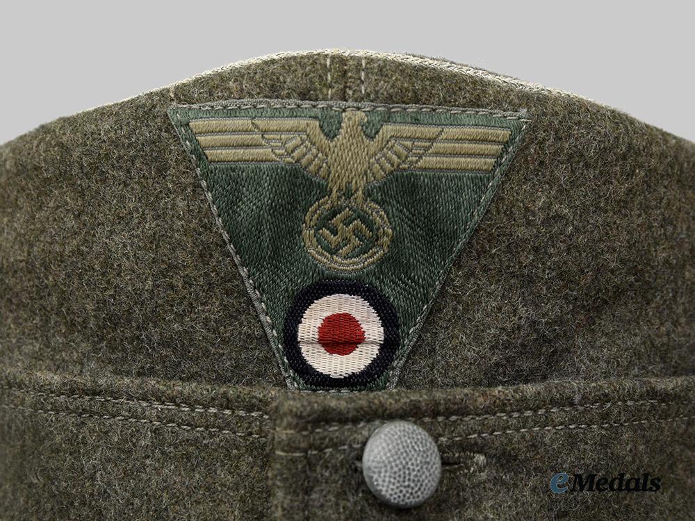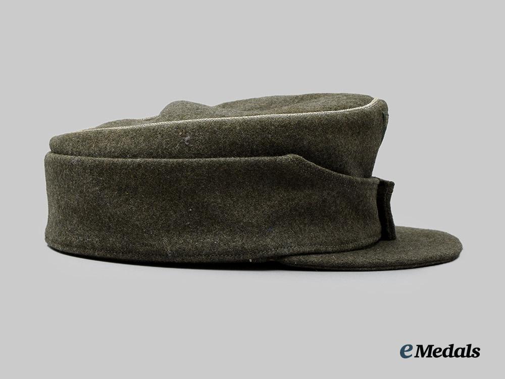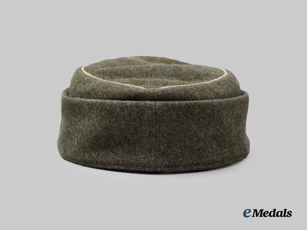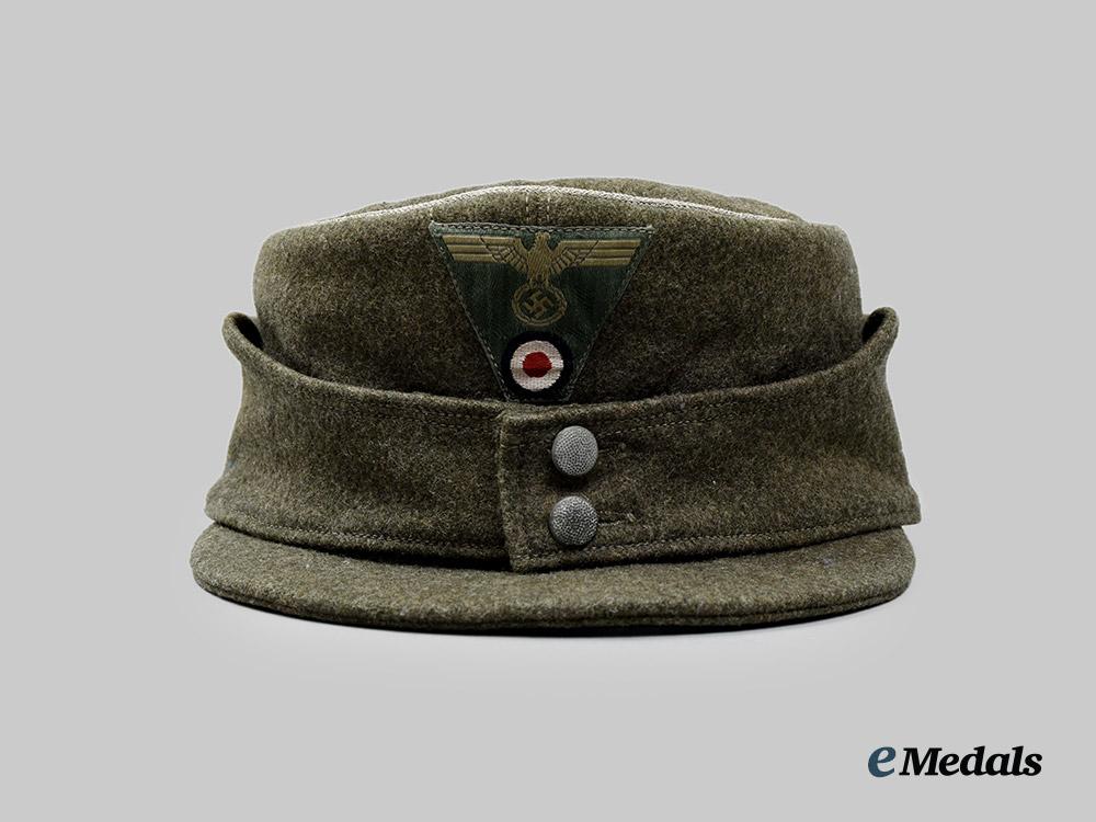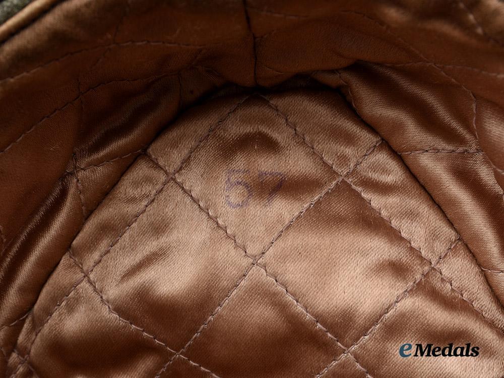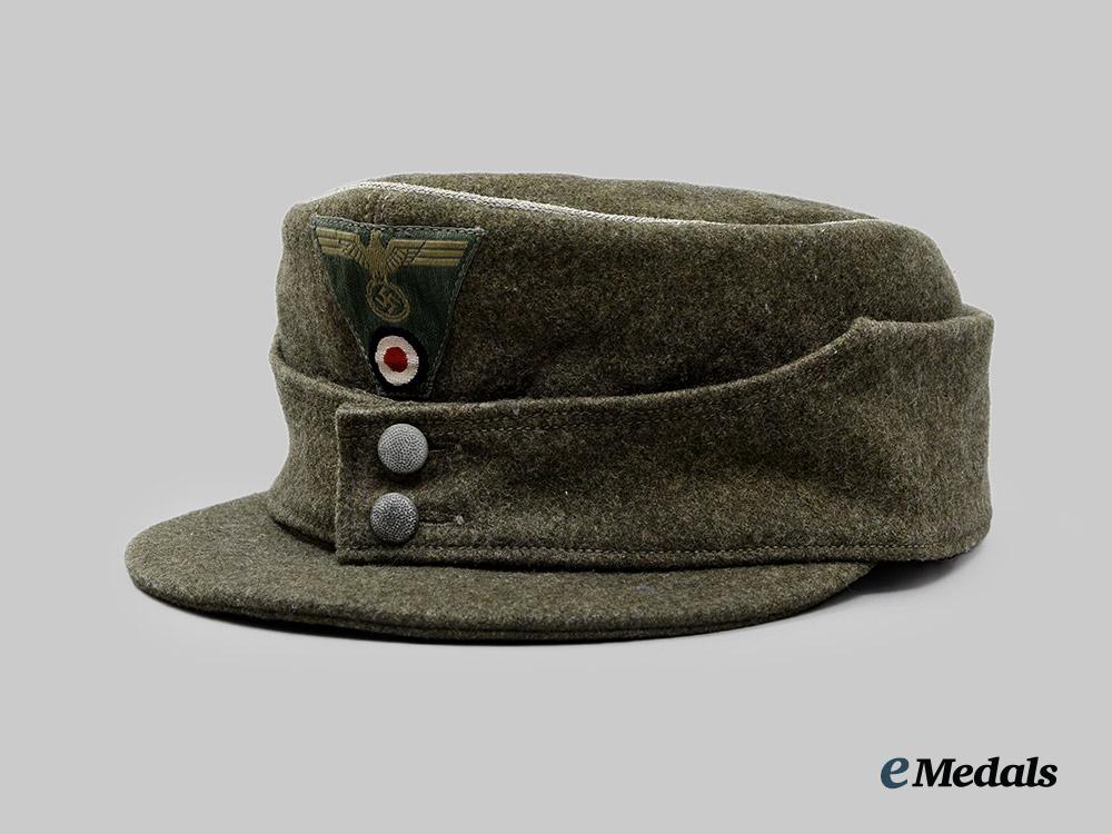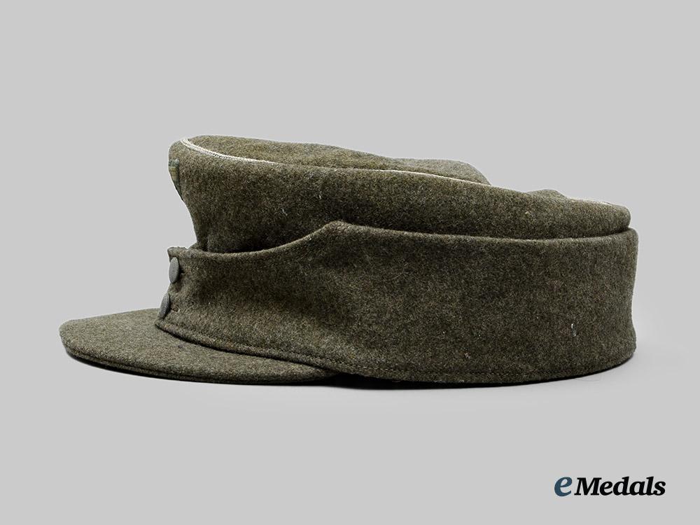 (Heer Einheitsfeldmütze M43 für Offiziere). An extremely well-preserved Heer Officer’s M43 field cap, constructed of field-grey wool. The cap is fully surrounded by fold-down side panels, scalloped toward the front, which provide optional ear and neck protection to the wearer. When not in use, the panels are rolled up and secured in place at the front with two pebbled zink buttons which emanate from the right flap and meet an equal number of reinforced buttonholes on the left. The outer edge of the crown is fully trimmed with a length of silver aluminum wire piping. Stitched onto the peak is an insignia consisting of a field-grey rayon trapezoid bearing a machine-embroidered tri-colour cockade, topped by a silver-grey Wehrmacht eagle clutching a wreathed mobile swastika. The insignia measures 55 mm (w) x 50 mm (h) overall. Completing the exterior features is a protruding visor consisting of a reinforced card stock core lined in identical wool cloth. The interior is fully encompassed by a padded beige rayon liner, featuring a cross-stitched quilt pattern. A size mark of “57” remains visible on the crown, while the cap is otherwise unmarked. It measures approximately 20 cm (w) x 27 cm (l) x 14 cm (h) as configured for wear. Minor issues consistent with age and wear are evident, and include some oxidation of the buttons, a minor patch of mothing to the underside of the visor, and soiling of the lower edge of the interior liner. Demonstrating the hallmarks of a quality example privately purchased by the owner, this cap remains in a near extremely fine condition.