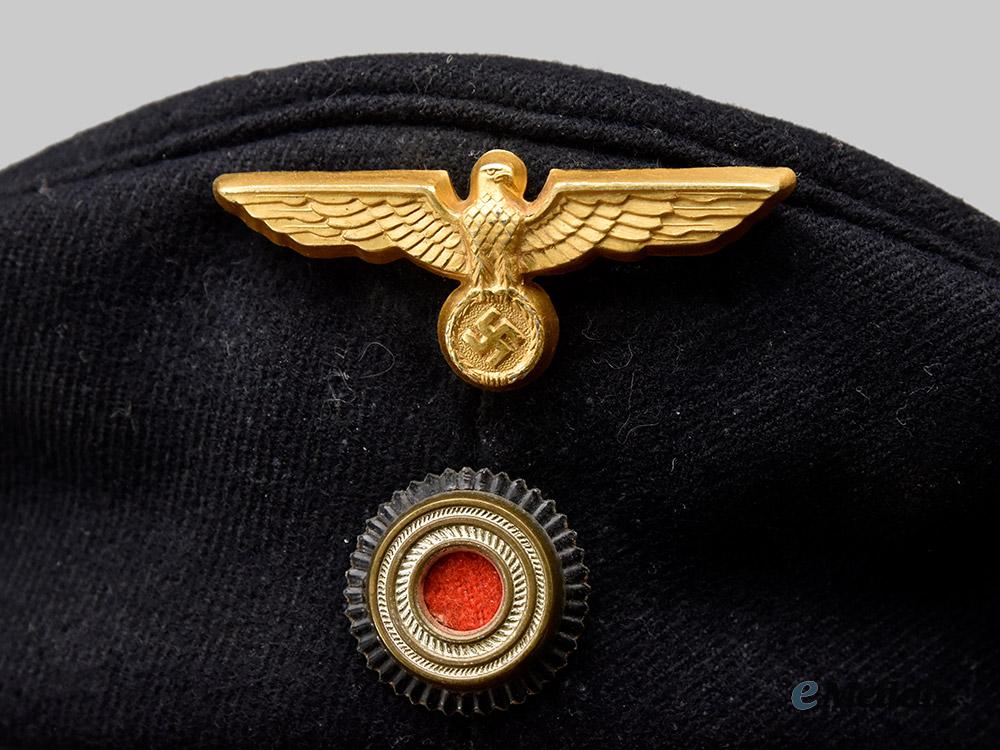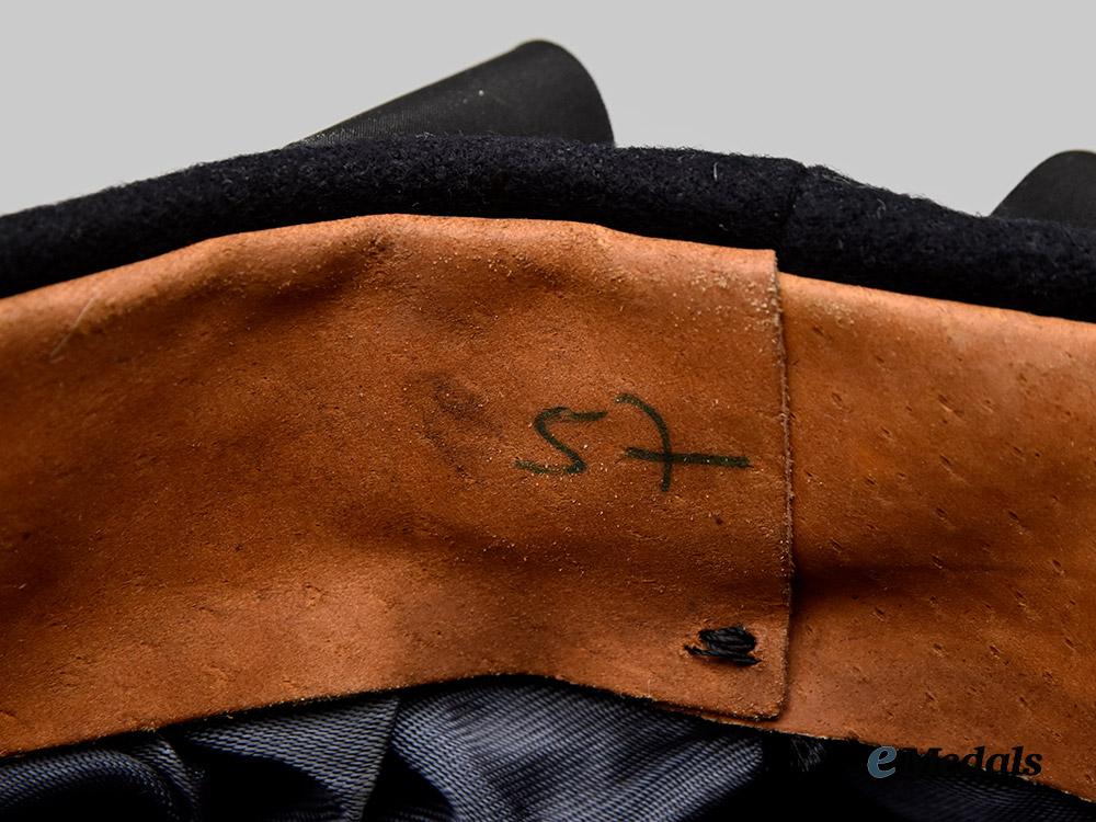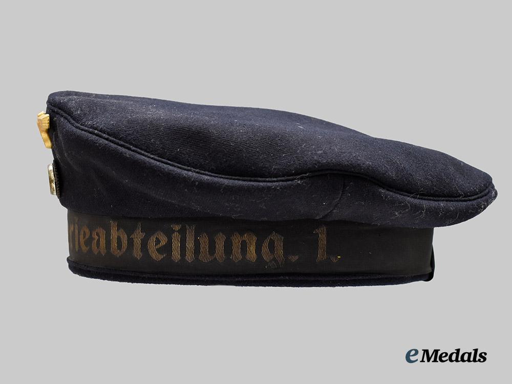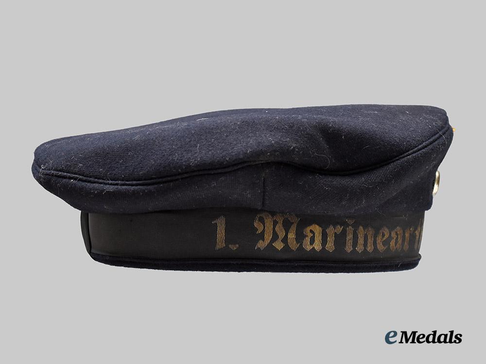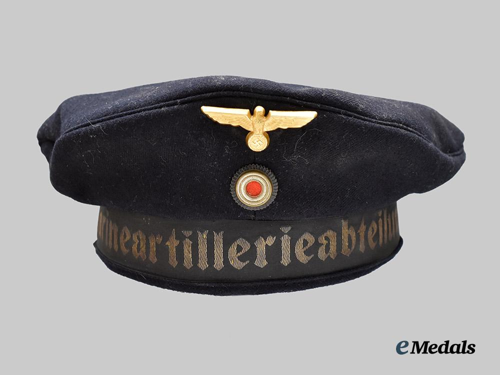 (Kriegsmarine Tellermütze für die Martineartillerie). A well-preserved Kriegsmarine blue sailor’s cap (also known as a “Donald Duck” cap), constructed of dark navy blue wool with a subtle whipcord weave. The cap is fully surrounded by reinforced side walls, liner on the exterior with a black rayon tally ribbon bearing a machine-embroidered gold bullion wire inscription of “1. MARINEARTILLERIEABTEILUNG 1.”, indicating issue to coastal artillery personnel. Pinned onto the peak is an insignia consisting of a gilded aluminum Kriegsmarine eagle clutching a wreathed mobile swastika. Measuring 52 mm (w) x 23 mm (h), the eagle retains its original singular reverse prong, and is maker marked with the logo of F.W. Assmann & Söhne, Lüdenscheid. Directly below the eagle, the cap is pinned with a tri-colour cockade, constructed of aluminum with a red wool centrepiece, measuring 23 mm in diameter. A brown leather sweatband surrounds the interior of the side walls, while a dark blue rayon liner fully encompasses the interior. A black ink size mark of “57” is faintly visible on the crown. Otherwise unmarked, the cap measures approximately 25 cm in diameter. Demonstrating minor material fatigue consistent with age and field use, this sailor’s cap remains in a near extremely fine condition.