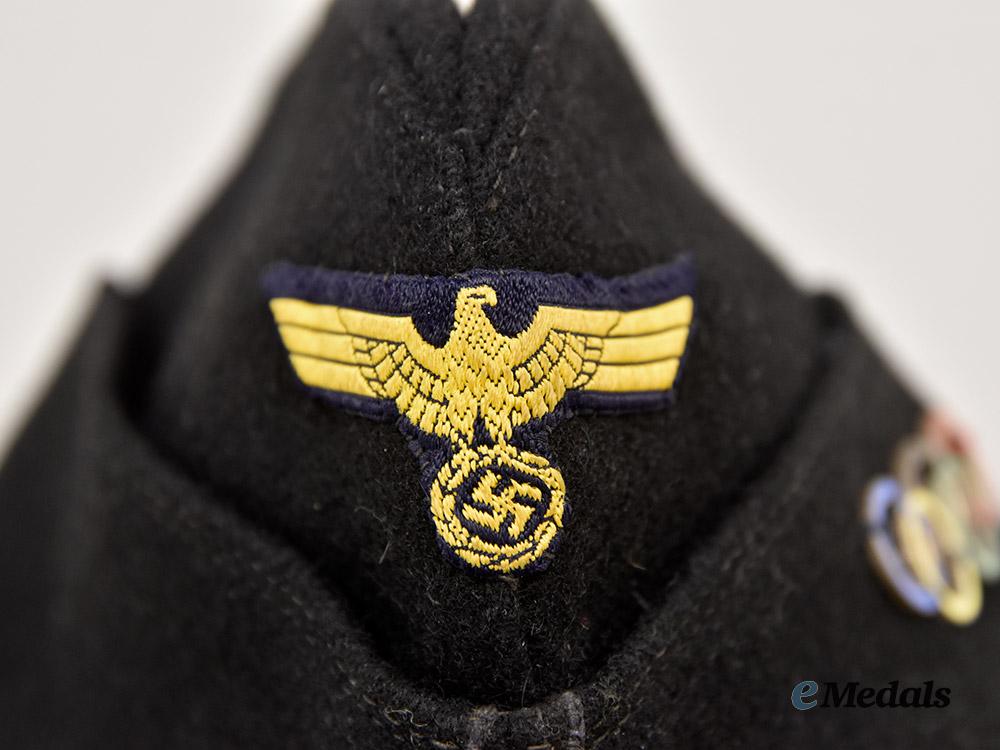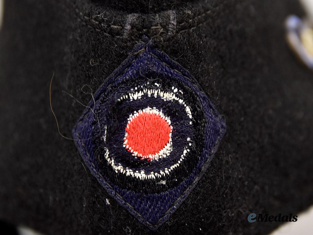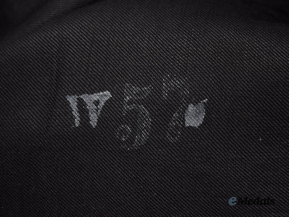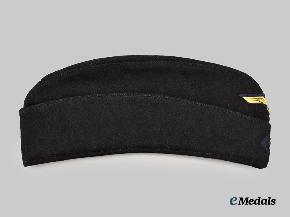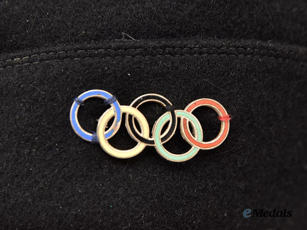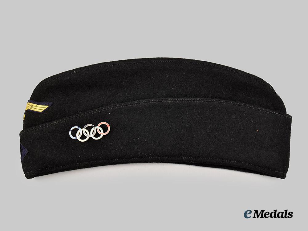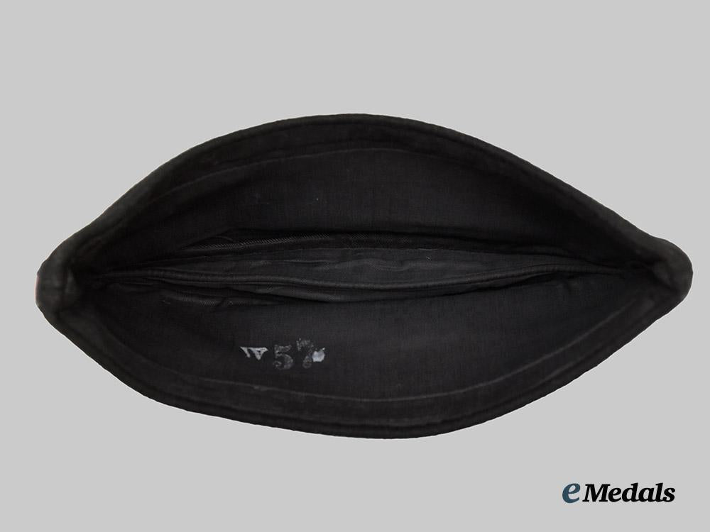 (Kriegsmarine dunkelblaues Schiffchen für Mannschaften). An interesting and well-preserved Kriegsmarine EM/NCO’s board cap, constructed of dark navy blue wool. An interesting and well-preserved Kriegsmarine EM/NCO’s board cap, constructed of dark navy blue wool. The cap is fully surrounded by fold-down side walls which gently slope toward the front. Stitched onto the peak is an insignia consisting of a dark navy blue rayon backer bearing a machine-embroidered golden-yellow Kriegsmarine eagle clutching a mobile swastika, measuring 70 mm (w) x 25 mm (h). Directly below the eagle, cap bears an additional insignia consisting of a machine-embroidered tri-colour cockade on a dark navy blue rayon backer, measuring 32 mm (w) x 32 mm (h). Notably, the left side of the side wall is embroidered with an Olympic ring decoration executed in silvered bronze with multi-coloured enamels, measuring 45 mm (w) x 20 mm (h), as worn by the crewmen of approximately 23 U-Boats who entered service during the year of the 1936 Berlin Olympics. The reverse of the badge is maker marked with the logo of Carl Poellath, Schrobenhausen. The interior of the cap is fully encompassed by a multi-piece black rayon liner, with a white ink size mark of “57” visible on the right. The cap measures approximately 29 cm (l) x 13 cm (h) when folded on a flat surface. Moderate fatigue is visible to the cockade, but the cap demonstrates no other notable damage or wear and is a scarce example in extremely fine condition.