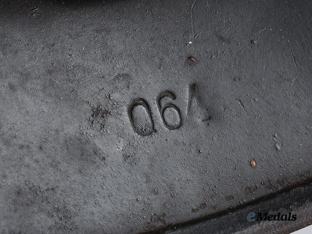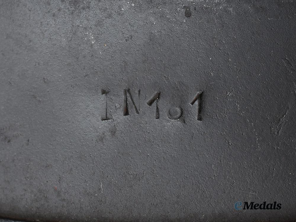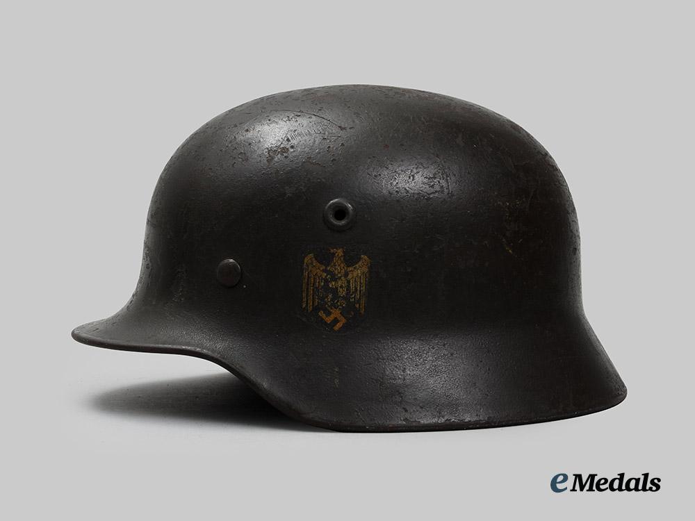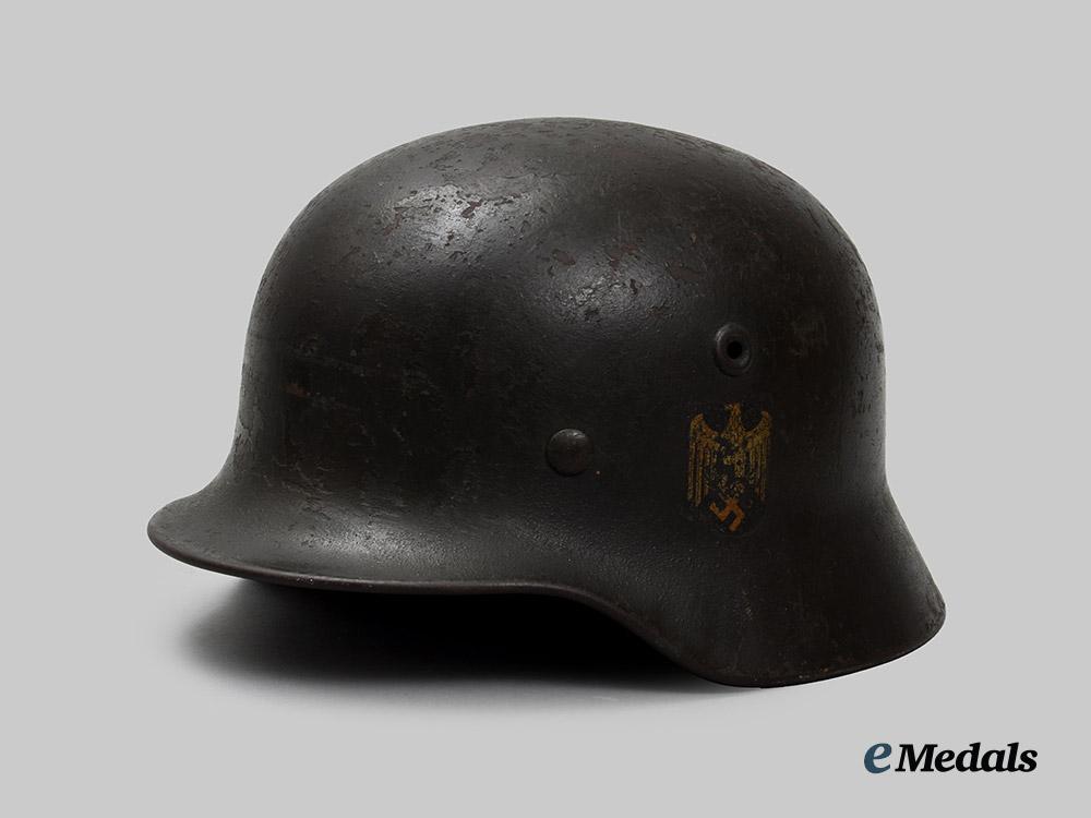 (Kriegsmarine Stahlhelm M40). A Heer M40 Stahlhelm, constructed of a single sheet of magnetic molybdenum steel which retains the majority of a wartime apple-green paint scheme. Three rivets are distributed around the outer circumference of the shell for the accommodation of the interior fixtures, while the crown is also flanked by a pair of integral ventilation holes. A decal is set in place directly beneath the left hole, and consists of a black shield overlaid by a gilded Heer-style German national eagle clutching a mobile swastika, measuring 32 mm (w) x 40 mm (h). The rim is fully crimped, providing a smooth edge throughout. The interior is surrounded by a magnetic metal ring, held in position with the shell rivets, which features a brown leather liner culminating in eight fingers, each perforated with five ventilation holes and an additional eyelet through which is looped an original drawstring. Two magnetic metal buckles descend from the ring and retain an original two-piece blackened leather chinstrap, perforated on one side with an array of eyelets to fit through a functional magnetic metal buckle. Stamped onto the left side of the skirt is a code of “Q64”, indicating production by Quist, Esslingen, with a shell size of 64. An additional partially-legible heat code is stamped onto the back of the skirt. The Stahlhelm measures approximately 23 cm (w) x 28 cm (l) x 14 cm (h). Issues consistent with age and field use are evident, and include spots of period paint restoration (particularly adjacent to the decal), some additional loss of paint, and moderate material fatigue to the leather liner with partial detachment from the ring. It remains in an overall better than very fine condition.