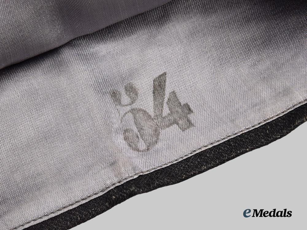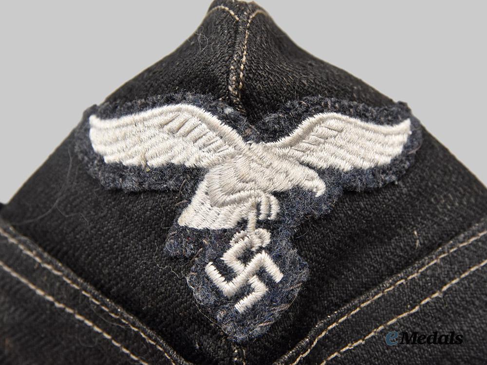 (Luftwaffe Schiffchen für Mechaniker). A well-preserved Luftwaffe Mechanic’s overseas cap, constructed of a dark slate-grey drill cloth. It is fully surrounded by fold-down side panels which slope down toward the front. Stitched onto the peak is an insignia consisting of a dark grey wool backer bearing a machine-embroidered silver-grey Luftwaffe eagle clutching a wreathed mobile swastika, measuring 76 mm (w) x 46 mm (h). The interior is fully encompassed by a multi-piece grey rayon linder. Stamped onto the left side is a size mark of “54” in black ink. Otherwise unmarked, the cap measures approximately 26.5 cm (l) x 10.5 cm (h) when folded on a flat surface. Demonstrating only minor signs of material fatigue, it remains in an extremely fine condition.