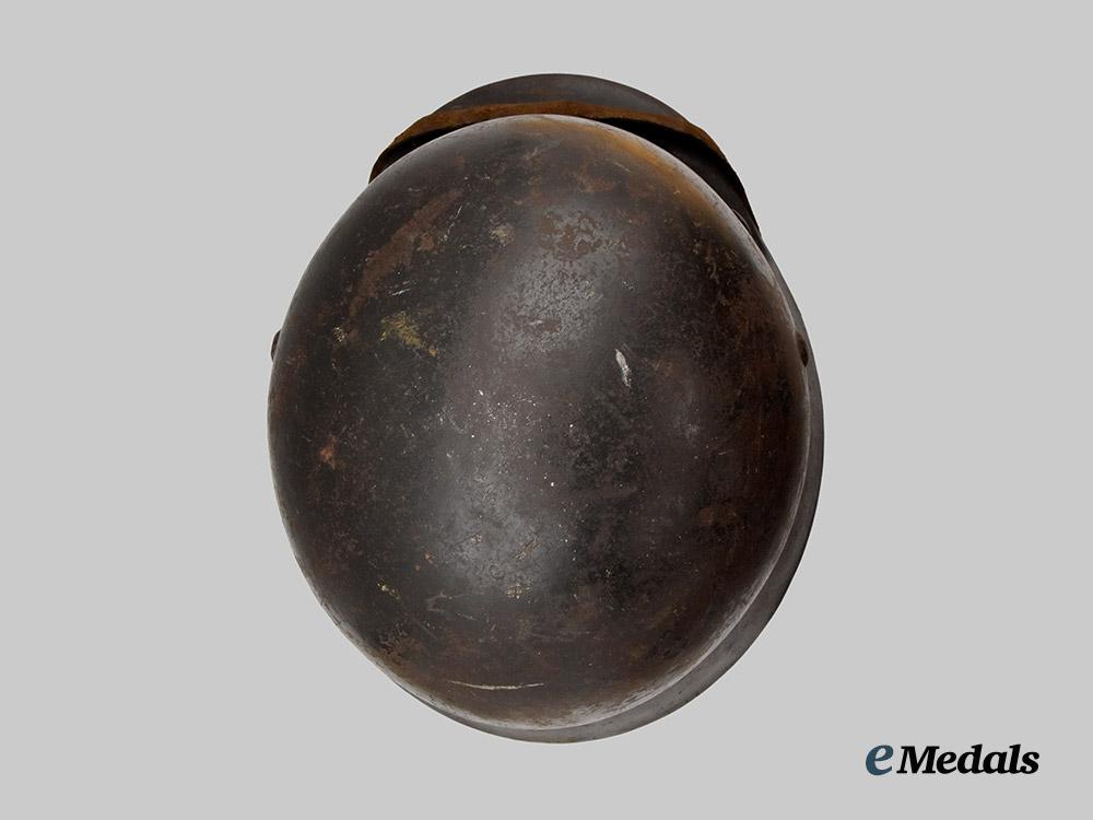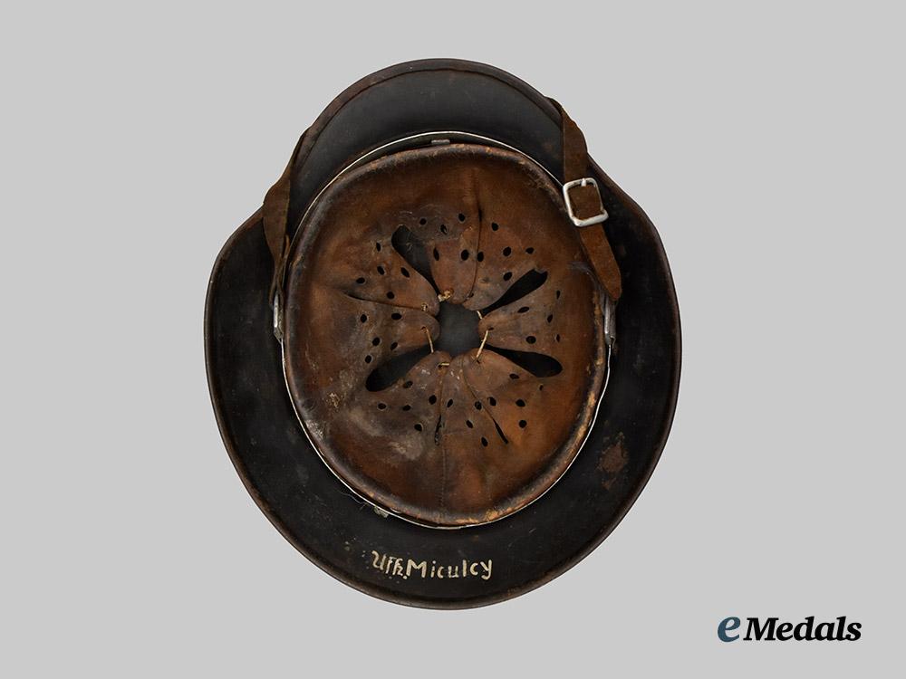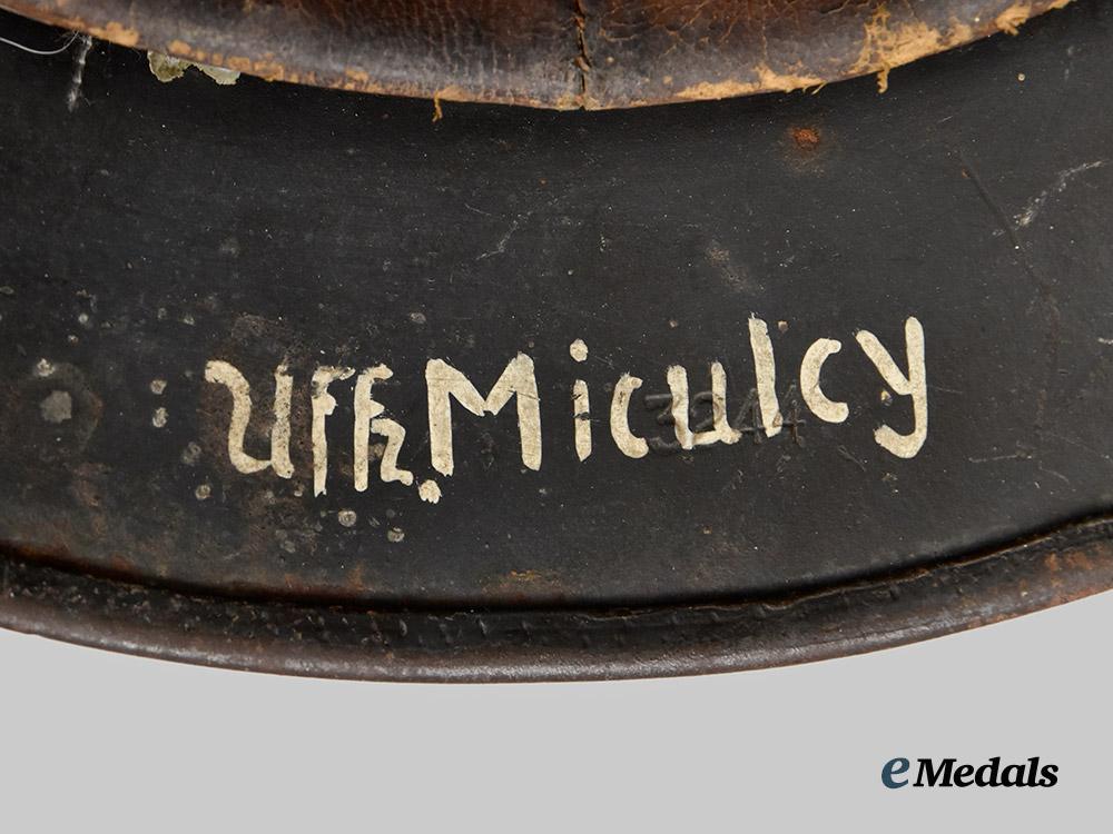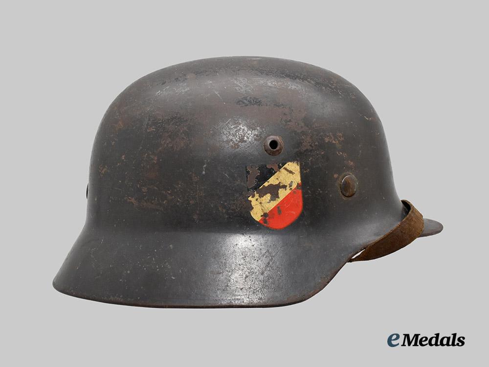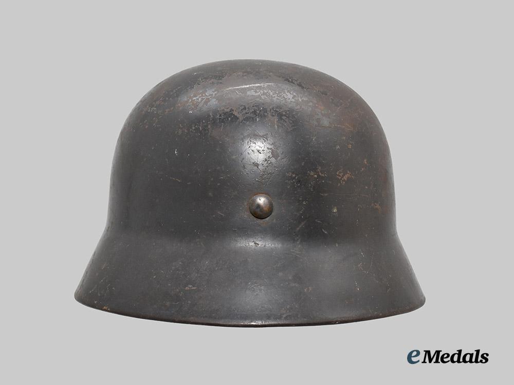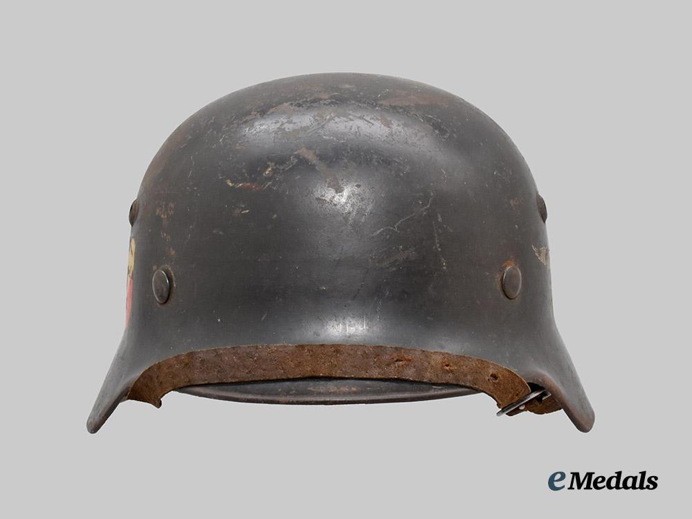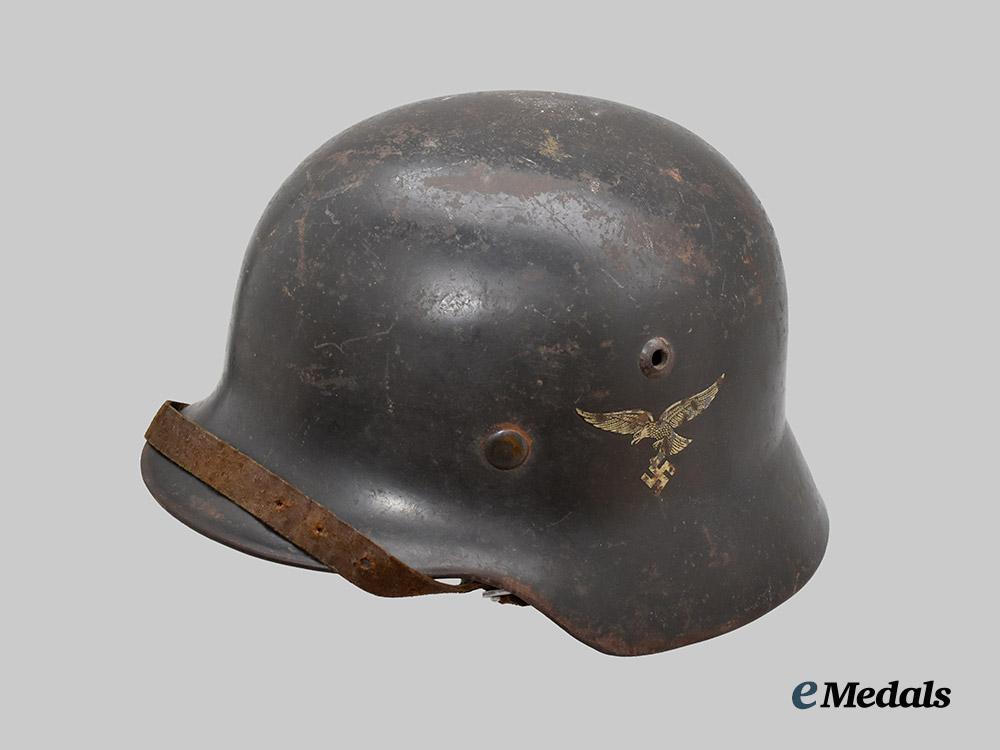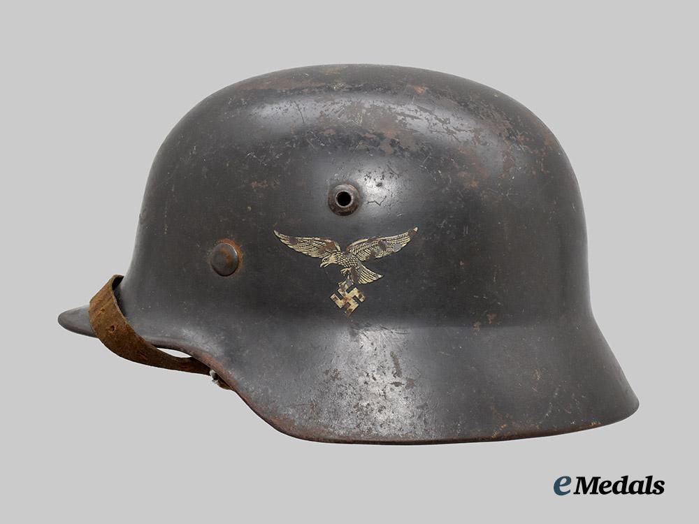 (Luftwaffe Stahlhelm M40). A well-preserved Luftwaffe double decal M40 Stahlhelm (steel helmet), constructed of a single sheet of magnetic molybdenum steel which retains the majority of its original slate-grey paint. Three rivets are distributed around the outer circumference for the accommodation of the interior hardware, while the crown is also flanked by integral ventilation shafts. A decal situated below the right shaft consists of a red, white, and black tri-colour shield, and measures 35 mm (w) x 40 mm (h). An additional decal applied below the left shaft consists of a silver-grey Luftwaffe eagle clutching a mobile swastika, with feathering and details highlighted in black, measuring 60 mm (w) x 40 mm (h) overall. The rim is fully crimped, providing the skirt with a smooth edge. An aluminum ring surrounds the interior of the crown, fixed in position with the shell rivets, and accommodates a brown leather liner which culminates in eight fingers, each perforated with five ventilation holes and topped by an additional eyelet which retains an original drawstring. Two aluminum loops flank the ring and retain an original two-piece leather chinstrap, adjusted with a functional aluminum buckle. Stamped onto the left side of the skirt is a code of “SE62”, indicating manufacture by Sächsische Emaillier- und Stanzwerke, Lauter, with a shell size of 62. A heat code of “3244” is visible at the back of the skirt. Notably, a handwritten owner’s name of “UFFZ. MICULCY” had been applied over the heat code in white paint. Measuring 22.5 cm (w) x 27.5 cm (l) x 14.5 cm (h), the helmet demonstrates minor issues consistent with age and field use, including sporadic loss of paint throughout the shell resulting in some surface oxidation, scratching and deterioration to the decals, and minor material fatigue to the leather elements. This unaltered and early war Luftwaffe helmet, attributed to its wartime owner, remains in an overall better than very fine condition.