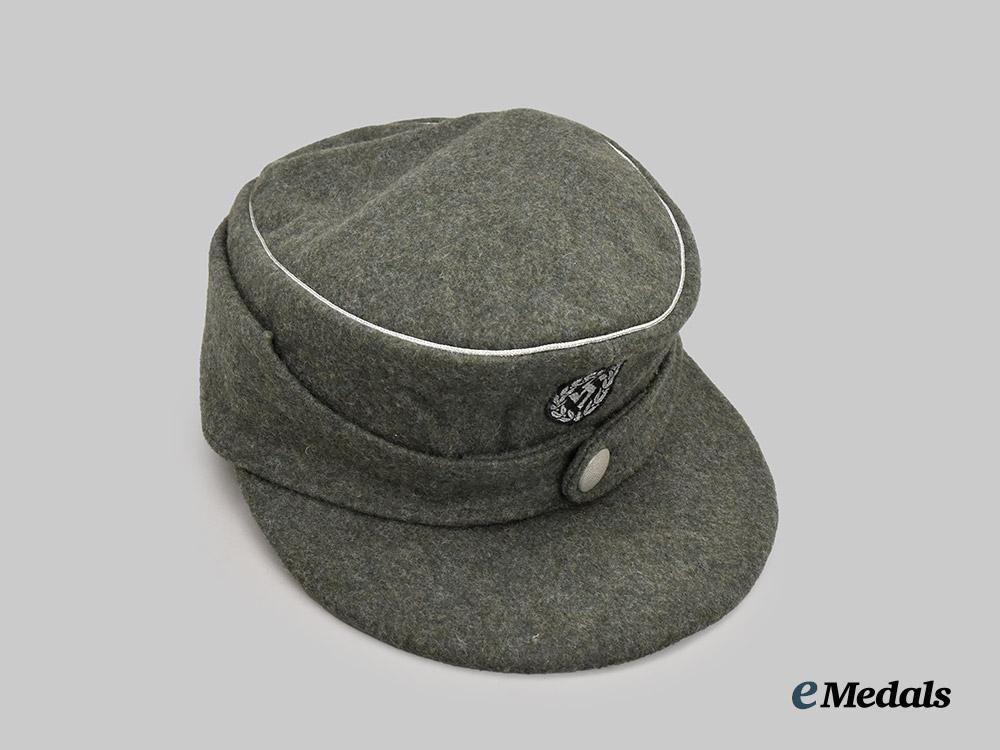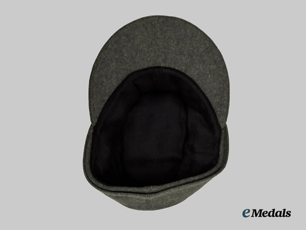 (Einheitsfeldmütze der Schutzmannschaften). A very well-preserved Schutzmannschaft (“Schuma”) M43-style field cap, constructed of police-green wool. The cap is fully surrounded by fold-down side panels, scalloped toward the front, which provide optional ear and neck protection to the wearer. When not in use, the panels roll up and are secured in position at the front with a single pebbled magnetic metal button on the left side meeting a reinforced buttonhole on the right. The outer edge of the crown is trimmed with a length of silver aluminum wire piping. Stitched onto the peak is an insignia consisting of a black rayon oval base bearing a machine-embroidered silver aluminum wire mobile swastika, situated within a laurel wreath of identical construction, measuring 30 mm (w) x 35 mm (h). A protruding visor completes the exterior features, and consists of a rigid card stock core fully lined in identical wool. A multi-piece black cotton/rayon blended cloth liner encompasses the interior. Unmarked, the cap measures approximately 21 cm (w) x 26 cm (l) x 14.5 cm (h). Demonstrating no notable damage or wear, this lightly field-worn example remains in an extremely fine condition.