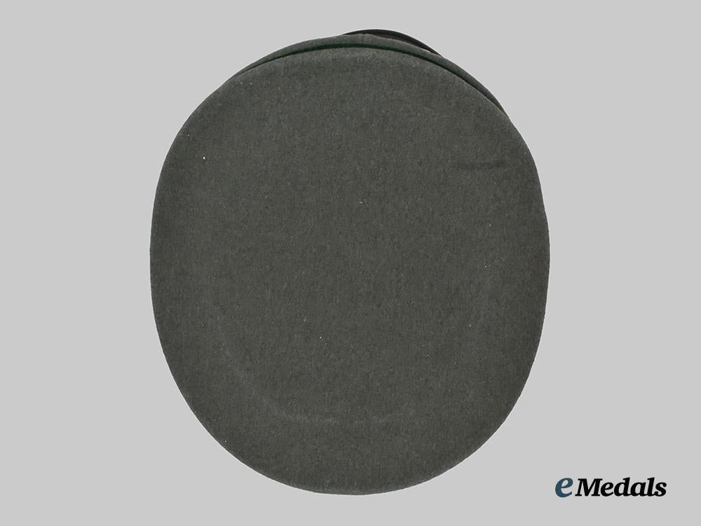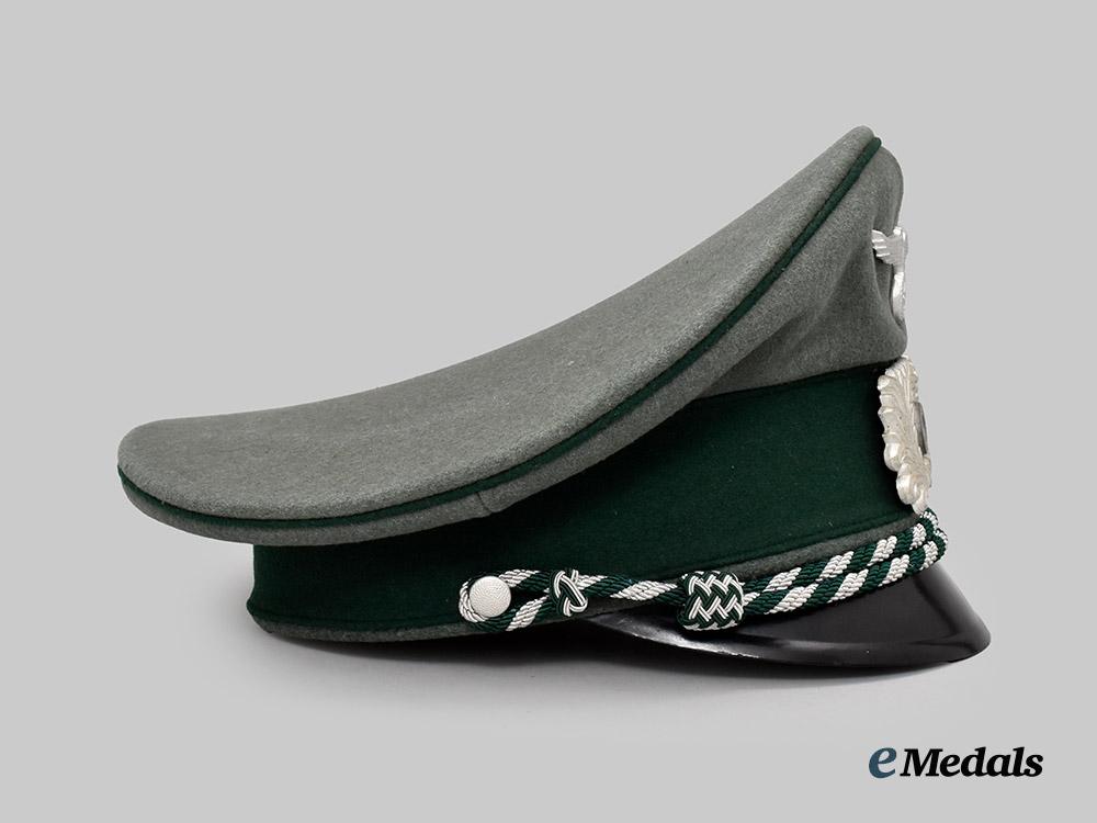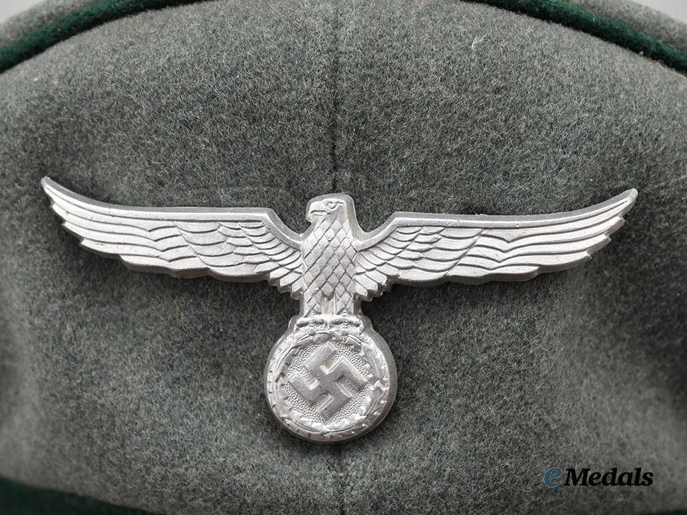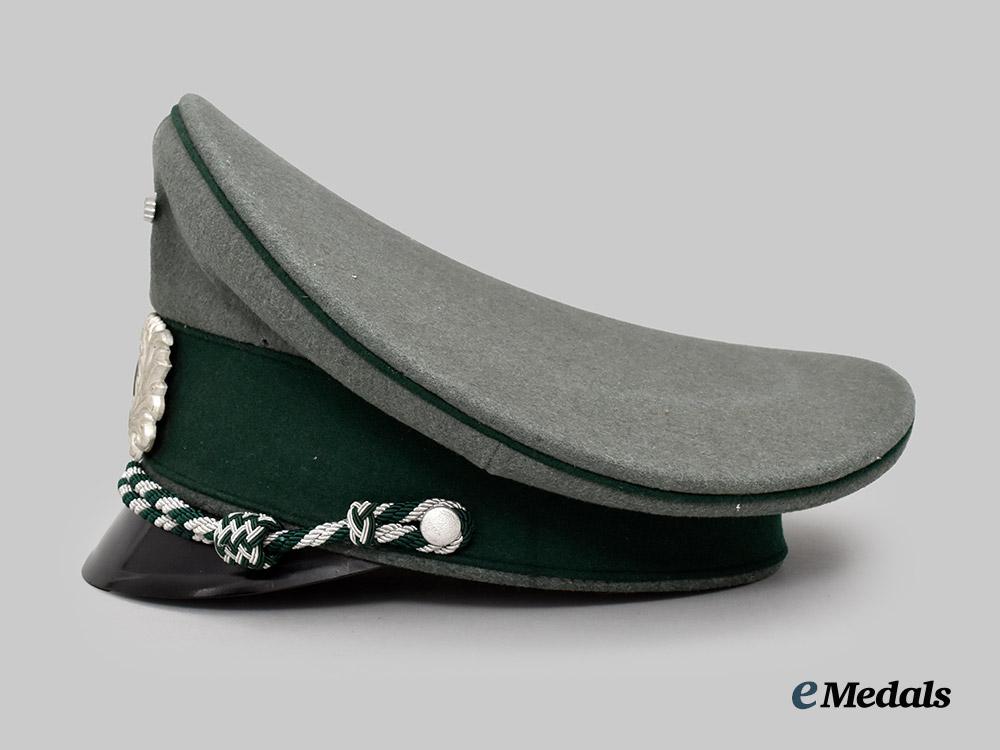 (Zollgrenzschutz Schirmmütze). A well-preserved Land Customs and Border Official’s visor cap, constructed of field-grey wool. It features reinforced side walls which are fully lined on the exterior with a dark green wool cap band. Both the top and bottom edges of the band are trimmed with dark green wool piping, while an additional length of identical piping borders the outer edge of the crown. Pinned onto the peak is an aluminum insignia in the form of a Customs-style German national eagle clutching a wreathed mobile swastika, measuring 72 mm (w) x 30 mm (h) and retaining all attachment prongs. Directly below the eagle, the centre of the cap band is pinned with a multi-piece Customs-style aluminum cockade and oak leaf wreath, measuring 62 mm (w) x 46 mm (h) and retaining all attachment prongs. The lower edge of the band is flanked by pebbled aluminum studs which accommodate a chinstrap constructed of twisted and rolled silver aluminum wire and green threading. A protruding black vulcanfibre visor completes the exterior features. The interior is encompassed by a multi-piece mint-green rayon liner, while a wide brown leather sweatband surrounds the walls. The crown retains a transparent plastic moisture guard which features a slot for the insertion of a name label. Unmarked, the cap measures approximately 23 cm (w) x 28.5 cm (l) x 16.5 cm (h). Minor and sporadic material fatigue is visible to the wool base, and includes some patches of mothing, while the sweatband demonstrates age-appropriate desiccation. The cap remains in a near extremely fine condition.