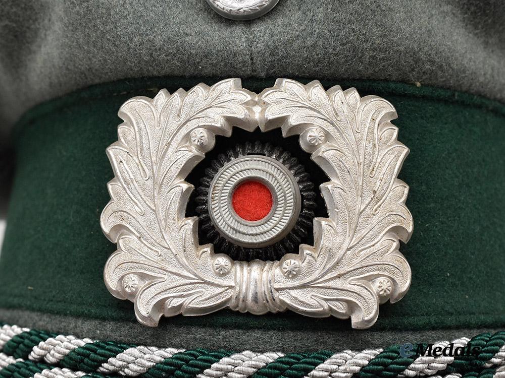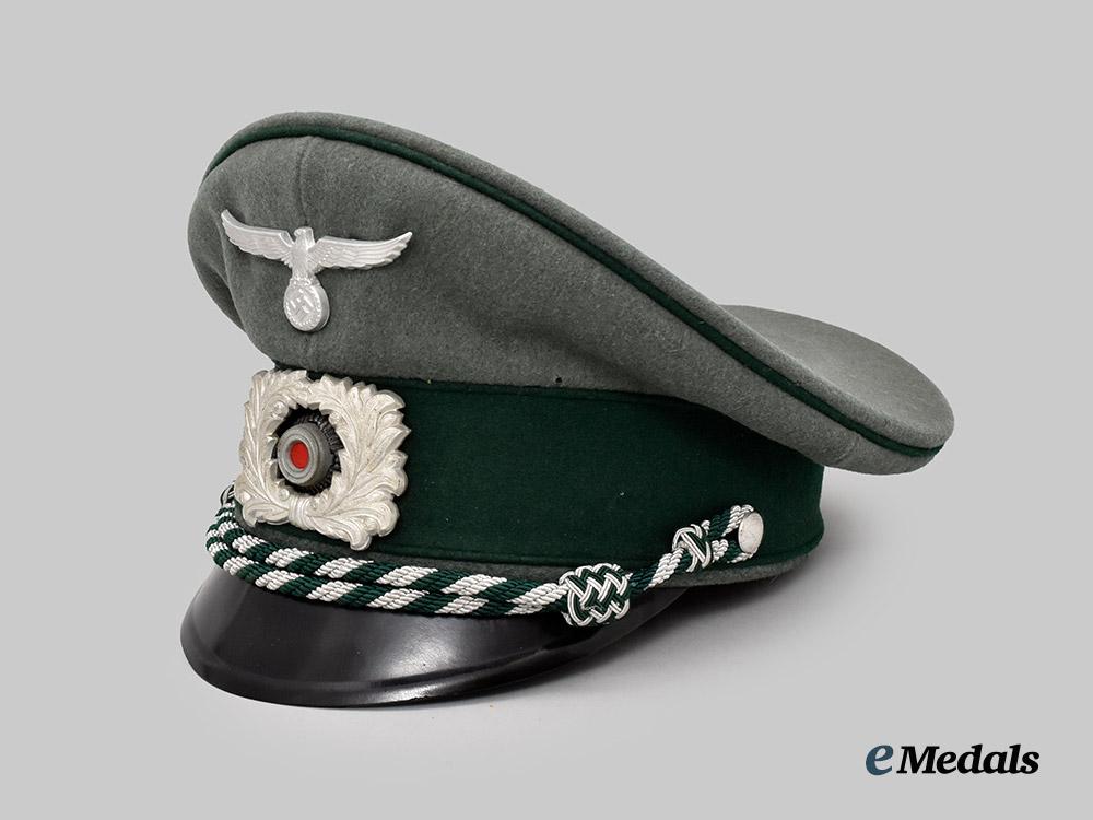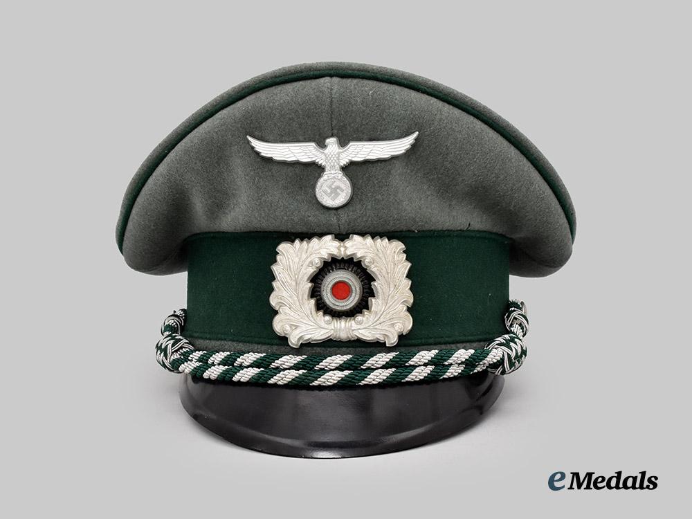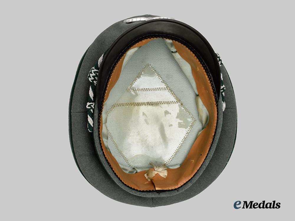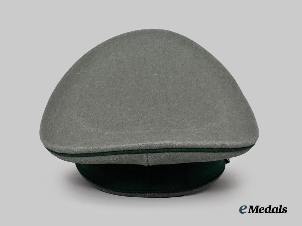 (Zollgrenzschutz Schirmmütze). A well-preserved Land Customs and Border Official’s visor cap, constructed of field-grey wool. It features reinforced side walls which are fully lined on the exterior with a dark green wool cap band. Both the top and bottom edges of the band are trimmed with dark green wool piping, while an additional length of identical piping borders the outer edge of the crown. Pinned onto the peak is an aluminum insignia in the form of a Customs-style German national eagle clutching a wreathed mobile swastika, measuring 72 mm (w) x 30 mm (h) and retaining all attachment prongs. Directly below the eagle, the centre of the cap band is pinned with a multi-piece Customs-style aluminum cockade and oak leaf wreath, measuring 62 mm (w) x 46 mm (h) and retaining all attachment prongs. The lower edge of the band is flanked by pebbled aluminum studs which accommodate a chinstrap constructed of twisted and rolled silver aluminum wire and green threading. A protruding black vulcanfibre visor completes the exterior features. The interior is encompassed by a multi-piece mint-green rayon liner, while a wide brown leather sweatband surrounds the walls. The crown retains a transparent plastic moisture guard which features a slot for the insertion of a name label. Unmarked, the cap measures approximately 23 cm (w) x 28.5 cm (l) x 16.5 cm (h). Minor and sporadic material fatigue is visible to the wool base, and includes some patches of mothing, while the sweatband demonstrates age-appropriate desiccation. The cap remains in a near extremely fine condition.