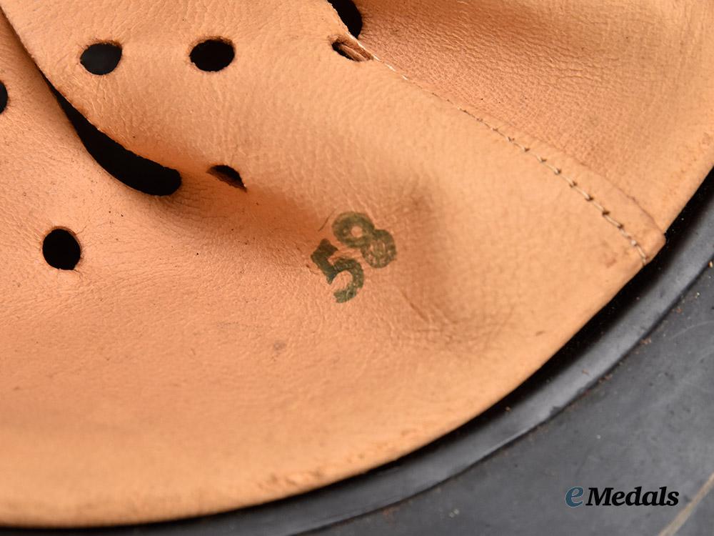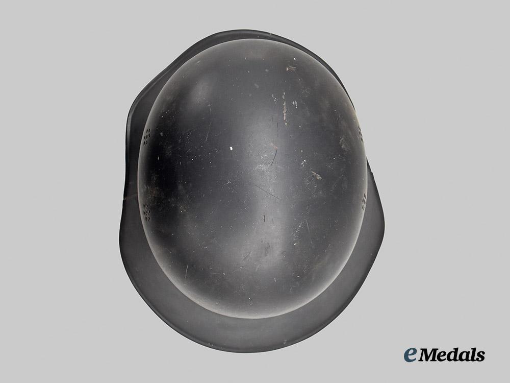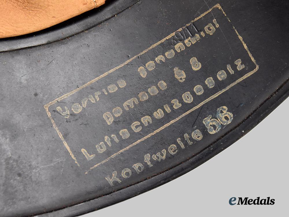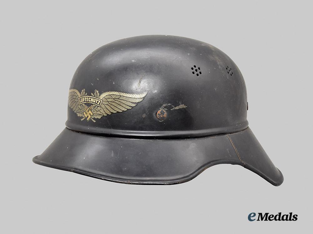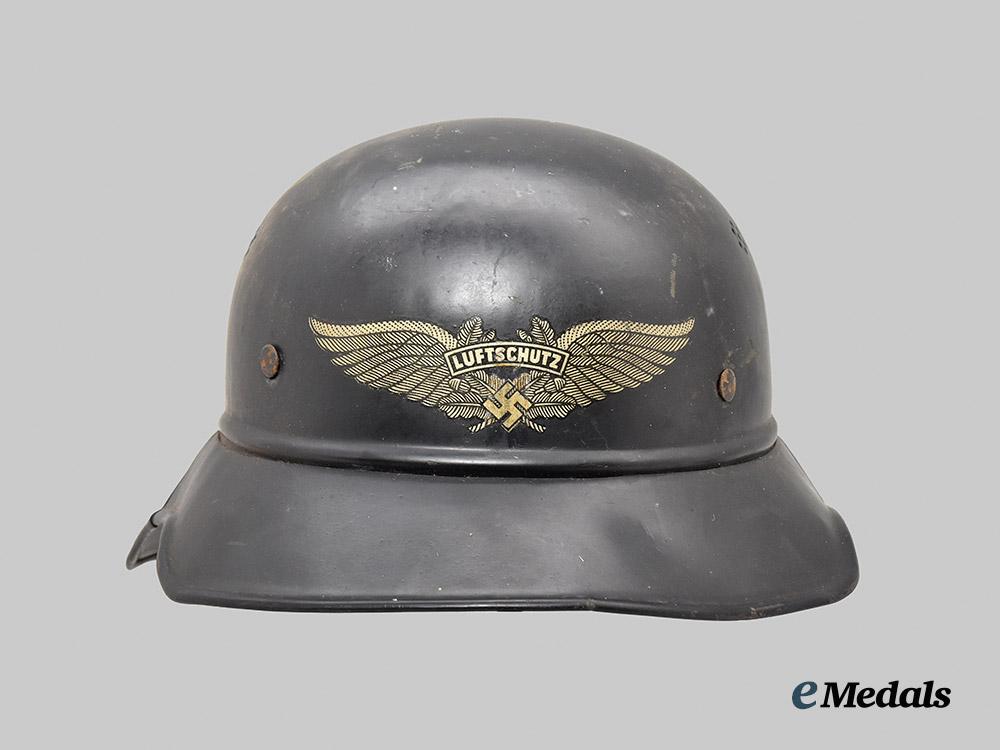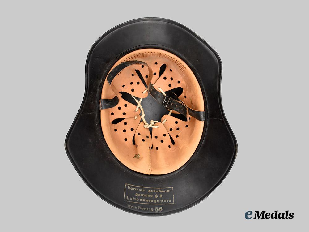 (Luftschutz Stahlhelm). An extremely well-preserved Luftschutz Stahlhelm (steel helmet), constructed of multiple panels of magnetic molybdenum steel and retaining the vast majority of its original dark slate-grey paint. Four rivets are distributed around the outer circumference for the accommodation of the interior fixtures, while the crown is flanked on each side by dual sets of ventilation holes consisting of seven eyelets each. The peak retains a mostly-intact Luftschutz decal executed in silver-grey with a transparent base, measuring 120 mm (w) x 35 mm (h). The transition point of the crown and skirt features a raised “bead” fully surrounding the shell, while the wide gladiator-style skirt is flanked by a seam where the individual pieces have been soldered together. A foam pad surrounds the interior of the crown and retains an intact light brown leather liner which culminates in nine fingers, each of which is perforated with five ventilation holes and topped by an additional eyelet through which is looped an original drawstring. The forehead is also perforated with an array of large ventilation holes for maximum comfort during wear. The back of the skirt demonstrates a white ink stamp indicating that the helmet was constructed in accordance with Luftschutz regulations and is a size 58. An additional size mark of “58” is stamped on the liner in black ink, along with a manufacture date of “1943”. The helmet measures approximately 26 cm (w) x 31 cm (l) x 16 cm (h). Demonstrating no notable damage or wear, this classic mid-war example remains in an extremely fine condition.