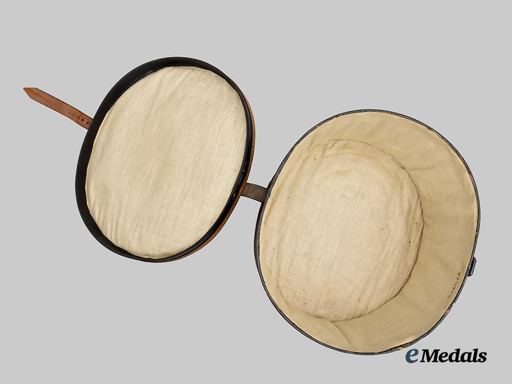 (Etui für Schirmmütze). An extremely well-preserved storage case issued alongside a Wehrmacht or SS Officer’s privately-purchased visor cap, constructed of a hardshell frame with a faux black leather exterior liner, both the base and lid reinforced with layer of light brown leatherette affixed in place with multiple rows of hand stitching, with an integral leather strap emanating from the back of the side walls and extending across the lid (held in place with dual blackened leather straps) to meeting a functional magnetic metal buckle stitched into the front of the side walls for a secure closure, opening to reveal an interior fully encompassed by a multi-piece white cotton/rayon blended liner, bearing a handwritten owner’s name of “KREMER”, otherwise unmarked, measuring 31 cm (w) x 18.5 cm (l) x 18.5 cm (h), demonstrating only minor material fatigue, a superb and high-quality accompaniment to an example of military Officer’s headgear privately commissioned from a hatter in extremely fine condition.