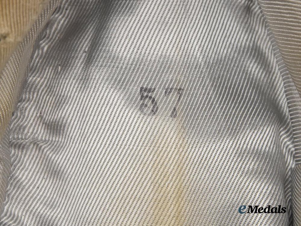 (Wehrmacht Schiffchen für Offiziere). A fine quality private purchase Wehrmacht Officer’s M38 overseas cap, constructed of field-grey wool. The cap is fully surrounded by fold-down side walls which gently slope down toward the front. The edge of the walls are lined near the front using a strip of silver aluminum bullion tresse, while the top is lined around the entirety of the cap with gilded tresse that has developed an even brown patina over time. Stitched onto the peak is an insignia consisting of a forest green backer featuring a machine-embroidered bullion Wehrmacht eagle clutching a wreathed mobile swastika. Directly below the eagle toward the centre of the cap is a thickly padded, circular, tri-colour cockade applied to the overseas cap, constructed of fine quality black and silver-coloured bullion wire embroidery with a red felt center. The interior is fully encompassed by a rayon-silk blended fabric that is light grey in colour with the addition of a dark grey leatherette sweatband towards the front of the cap. It is size-marked “57” in black but is otherwise unmarked. The cap measures approximately 285 mm (w) x 105 mm (l) when folded on a flat surface. It demonstrates minor to moderate soiling and material fatigue with light mothing throughout, in overall better than very fine condition.