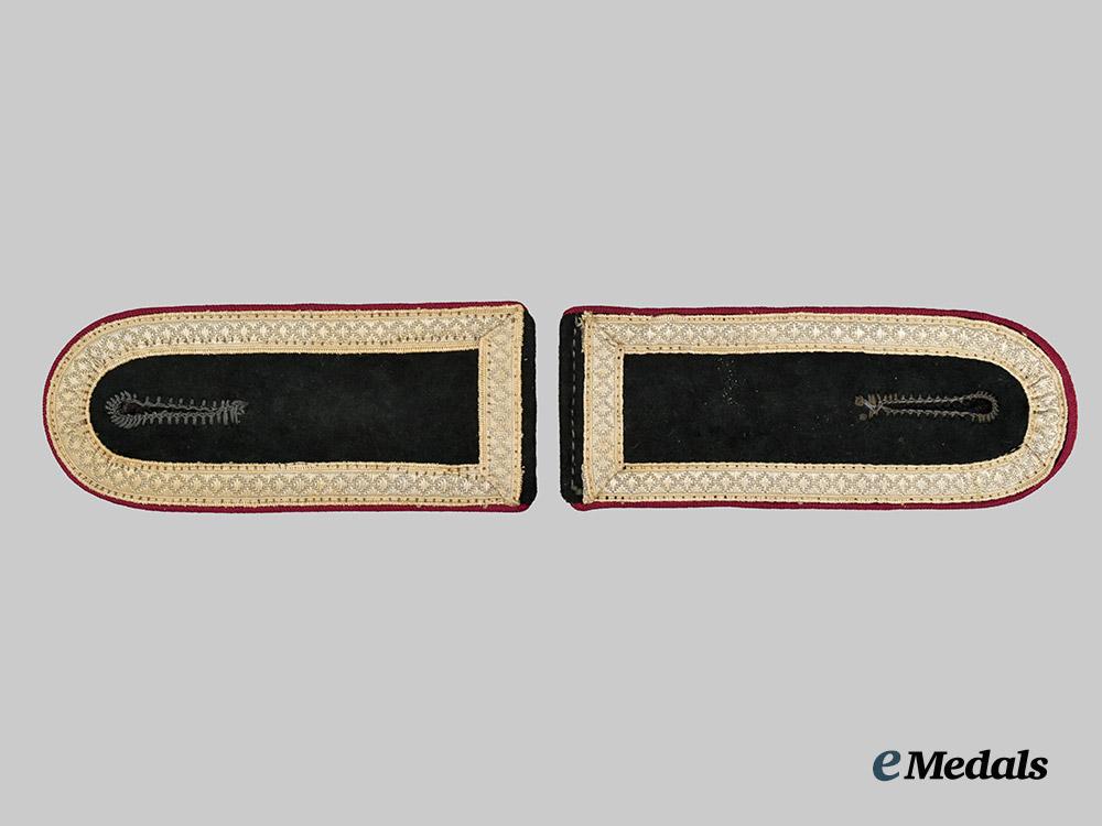 (Heer Schulterklappen für einen Feldwebel der Nebeltruppe). A set of Heer Smoke/Chemical Troops Unterfeldwebel shoulder straps, each constructed of dark green wool, trimmed with Bordeaux-red piping, and bordered by silver aluminum wire tresses, the reverse of each retaining an unperforated integral strap, both unmarked, one strap measuring 46 mm (w) x 115 mm (l) and the other measuring 48 mm (w) x 110 mm (l), demonstrating minor material fatigue to the obverse of the longer strap, a mis-matched set in near extremely fine condition.