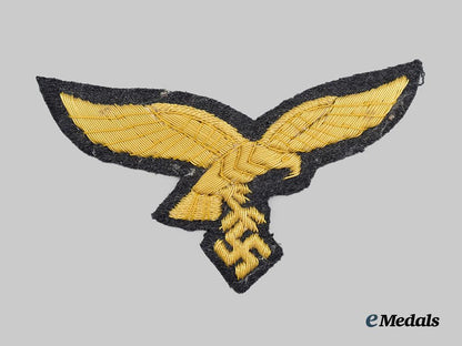 (Luftwaffe Brustadler für einen General). Constructed of dark grey wool, the obverse bearing a golden-yellow celleon wire Luftwaffe eagle clutching a mobile swastika, the reverse featuring a black cotton/rayon blended liner, unmarked, measuring 95 mm (w) x 55 mm (h), a second pattern insignia in extremely fine condition.