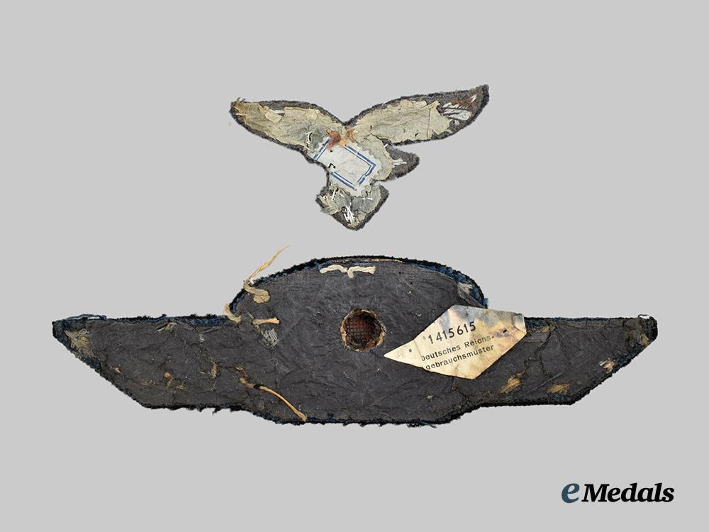 1. An eagle, constructed of dark grey wool, the obverse bearing a hand-embroidered Luftwaffe eagle clutching a mobile swastika, the reverse retaining a partially-intact paper backer and period label, measuring 62 mm (w) x 35 mm (h), demonstrating minor material fatigue, in uniform-removed and near extremely fine condition.