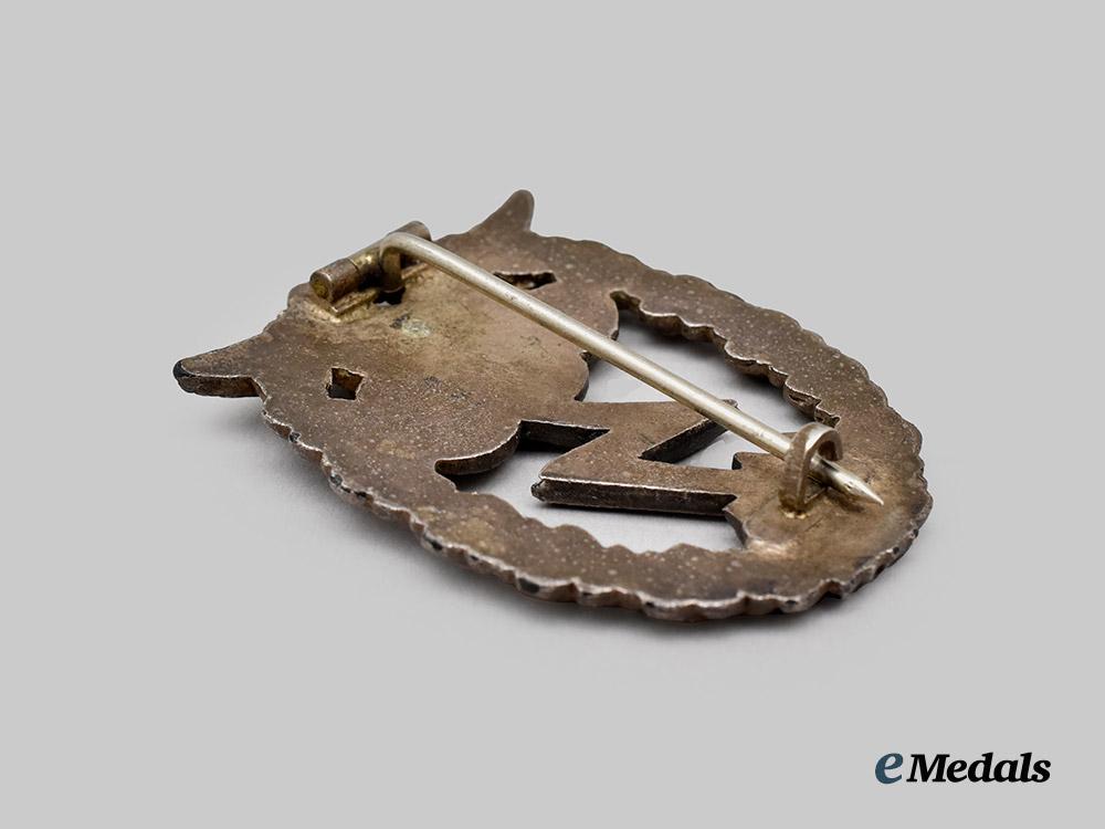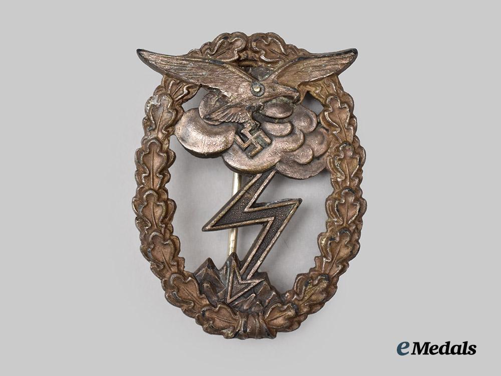(Erdkampfabzeichen der Luftwaffe). Constructed of silvered zink, the obverse consisting of an oval oak leaf wreath, joined together at the bottom by ribbon, topped by a Luftwaffe eagle clutching a mobile swastika overlaying a stylized cloud from which a lightning bolt emanates and strikes the ground, the reverse with a single visible rivet formerly accommodating an eagle plate on the obverse, with a barrel hinge and vertical pinback meeting a flat wire catch emanating from an oblong plate, unmarked but demonstrating the characteristics of manufacture by C.E. Juncker, Berlin, measuring 43.03 mm (w) x 56.09 mm (h), weighing 26.7 grams, the obverse eagle plate is missing (leaving the rivet exposed) and loss of silver finish is evident throughout the base metal, in very fine condition.