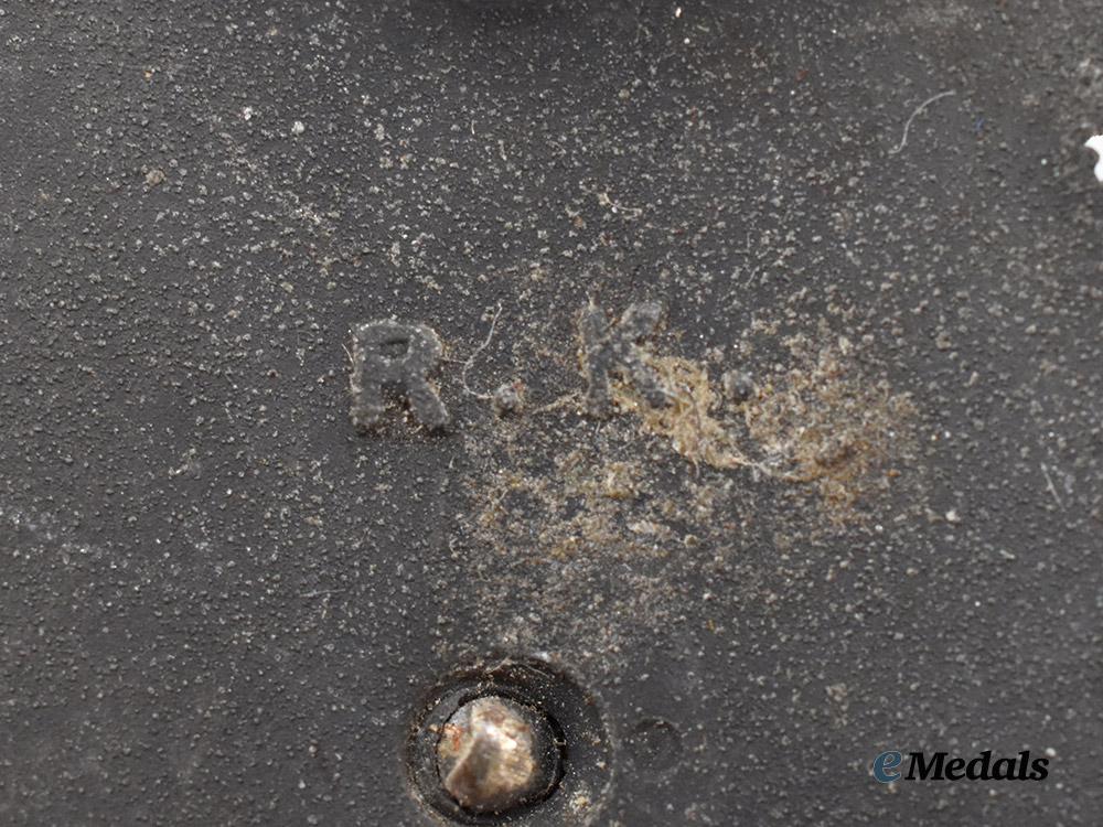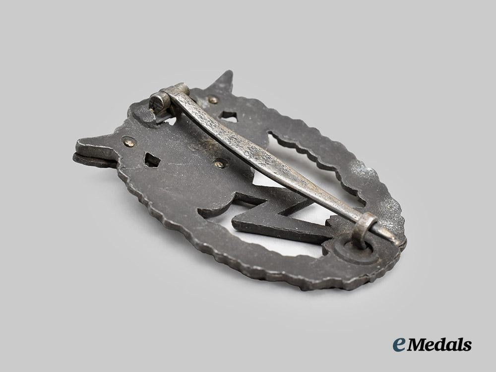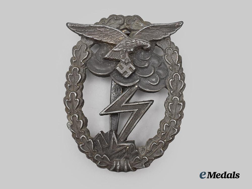 (Erdkampfabzeichen der Luftwaffe). Constructed of silvered and patinated zink, the obverse consisting of an oval oak leaf wreath, joined together at the bottom by ribbon, topped by a Luftwaffe eagle clutching a mobile swastika, overlaying a stylized cloud from which a lightning bolt emanates and strikes the ground, the reverse with three visible rivets securing the eagle in position, with a barrel hinge emanating from a crimped base and banjo-style pinback meeting a flat wire catch emanating from a circular base, maker marked with the logo of Rudolf Karneth, Gablonz, demonstrating near-total loss of finish to the base metal with minor oxidation visible to the lower right edge of the reverse, in very fine condition.