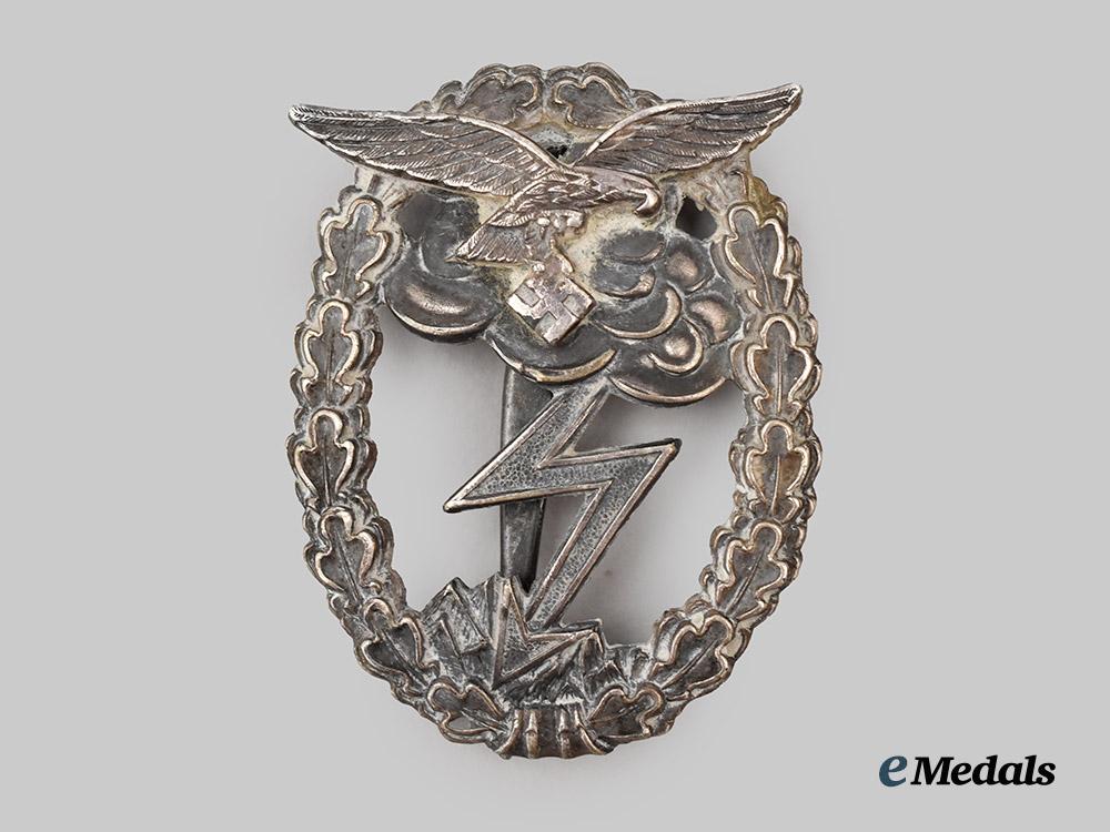 (Erdkampfabzeichen der Luftwaffe). Constructed of silvered zink, the obverse consisting of an oval oak leaf wreath, joined together at the bottom by ribbon, topped by a Luftwaffe eagle clutching a mobile swastika, overlaying a stylized cloud from which a lightning bolt emanates and strikes the ground, the reverse with three visible rivets securing the eagle in position, with a crimped barrel hinge and banjo-style pinback meeting a flat wire catch emanating from a crimped base, maker marked with the logo of Rudolf Karneth, Gablonz, measuring 43.40 mm (w) x 56.32 mm (h), weighing 27.5 grams, demonstrating minor loss of finish throughout the base metal, in better than very fine condition.