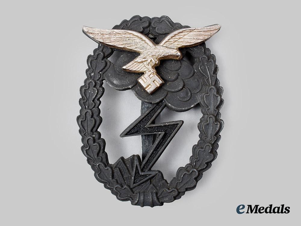(Erdkampfabzeichen der Luftwaffe). Constructed of silvered and patinated zink, the obverse consisting of an oval oak leaf wreath, joined together at the bottom by ribbon, topped by a Luftwaffe eagle clutching a mobile swastika, overlaying a cloud from which a lightning bolt emanates and strikes the ground, the reverse with three visible rivets securing the eagle in position, with a crimped barrel hinge and tapering vertical pinback meeting a flat wire catch, maker marked with the logo of Rudolf Karneth, Gablonz, measuring 43.90 mm (w) x 57.11 mm (h), weighing 31.1 grams, demonstrating near-total loss of finish to the zink base, in very fine condition.