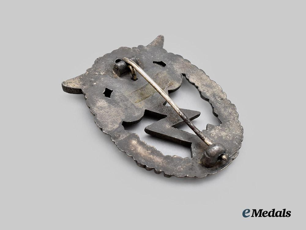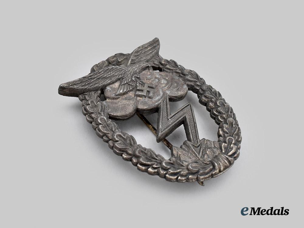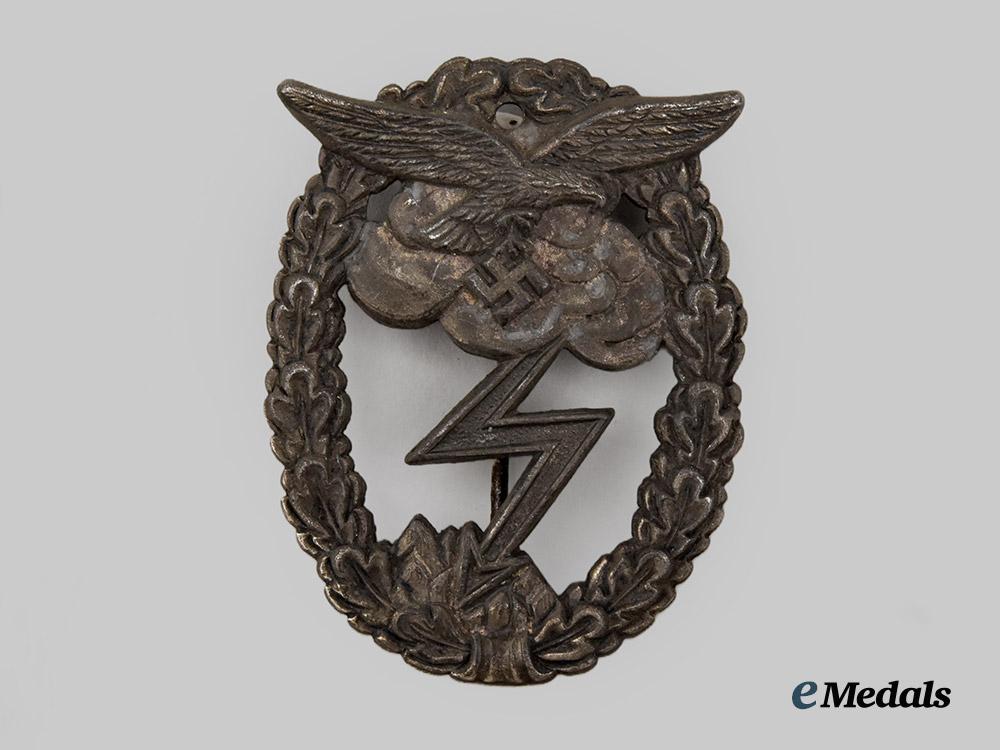(Erdkampfabzeichen der Luftwaffe). Instituted March 31st, 1942. A textbook example of this award constructed of silvered and patinated zinc, the obverse consisting of an oval oak wreath, joined together at the base by ribbon, topped by a Luftwaffe eagle clutching a mobile swastika, overlaying a stylized cloud from which a lightning bolt emanates and strikes the ground, the reverse is rivitless as is expected from a late war example, with an integrated cast hinge, round vertical pinback, and integrated cast catch, unmarked, measuring 43.0 mm (w) x 56.7 mm (l), weighing 34.52 grams, all of its silver finish has vanished through time, in very fine condition.
