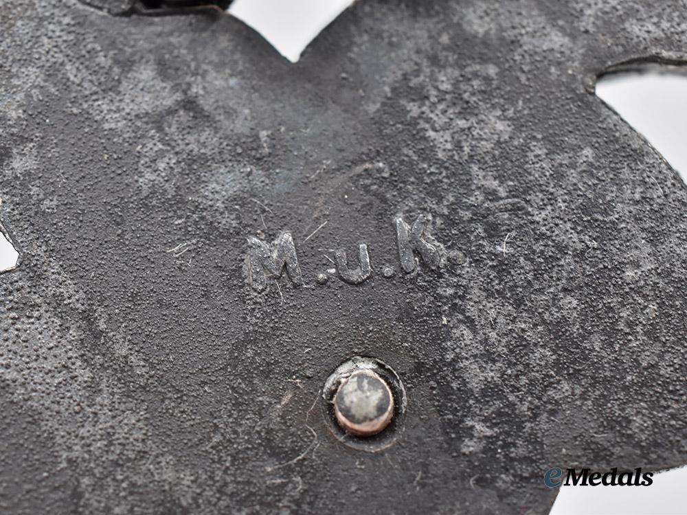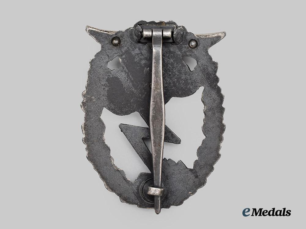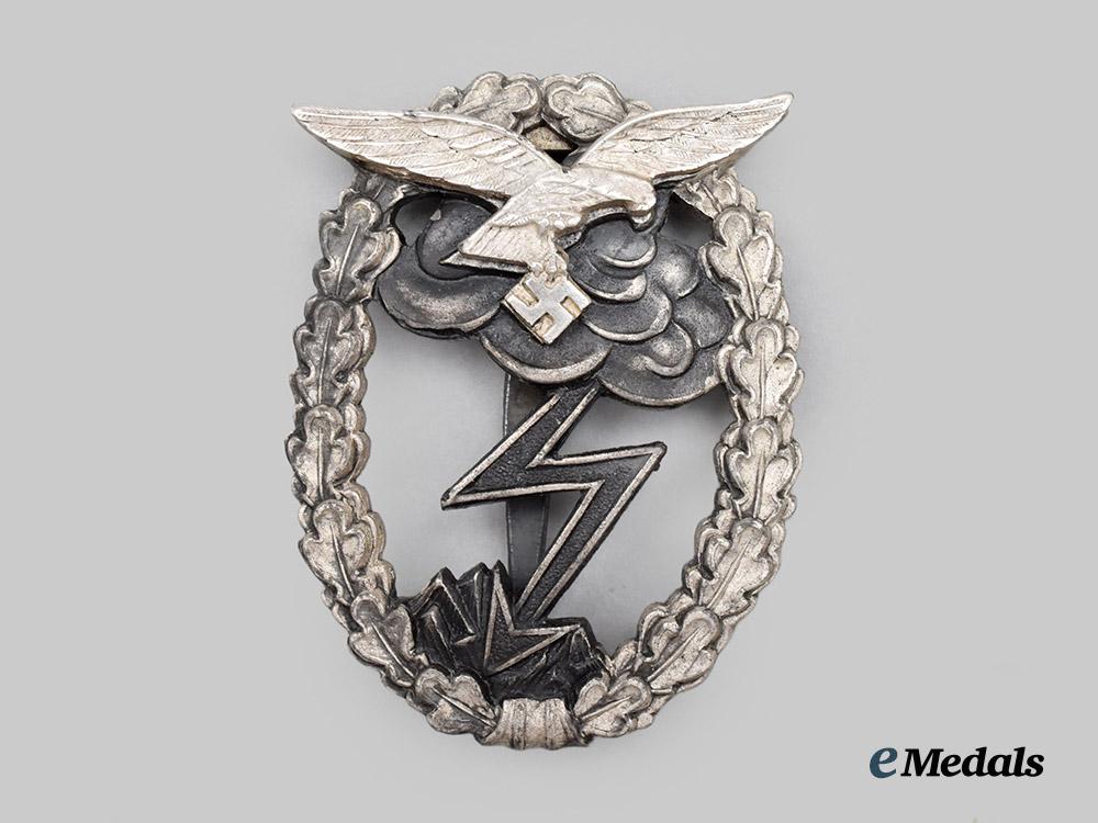 (Erdkampfabzeichen der Luftwaffe). Constructed of silvered and patinated zink, the obverse consisting of an oval oak leaf wreath, joined together at the bottom by ribbon, topped by a Luftwaffe eagle clutching a mobile swastika, overlying a stylized cloud from which a lightning bolt emanates and strikes the ground, the reverse with two visible rivets securing the eagle in position, with a barrel hinge emanating from a crimped base and banjo-style pinback meeting a flat wire catch, maker marked with the logo of Arbeitsgemeinschaft Metall und Kunststoff, Gablonz, measuring 43.23 mm (w) x 56.37 mm (h), weighing 32.8 grams, a high-quality example produced by a desirable manufacturer in near mint condition.