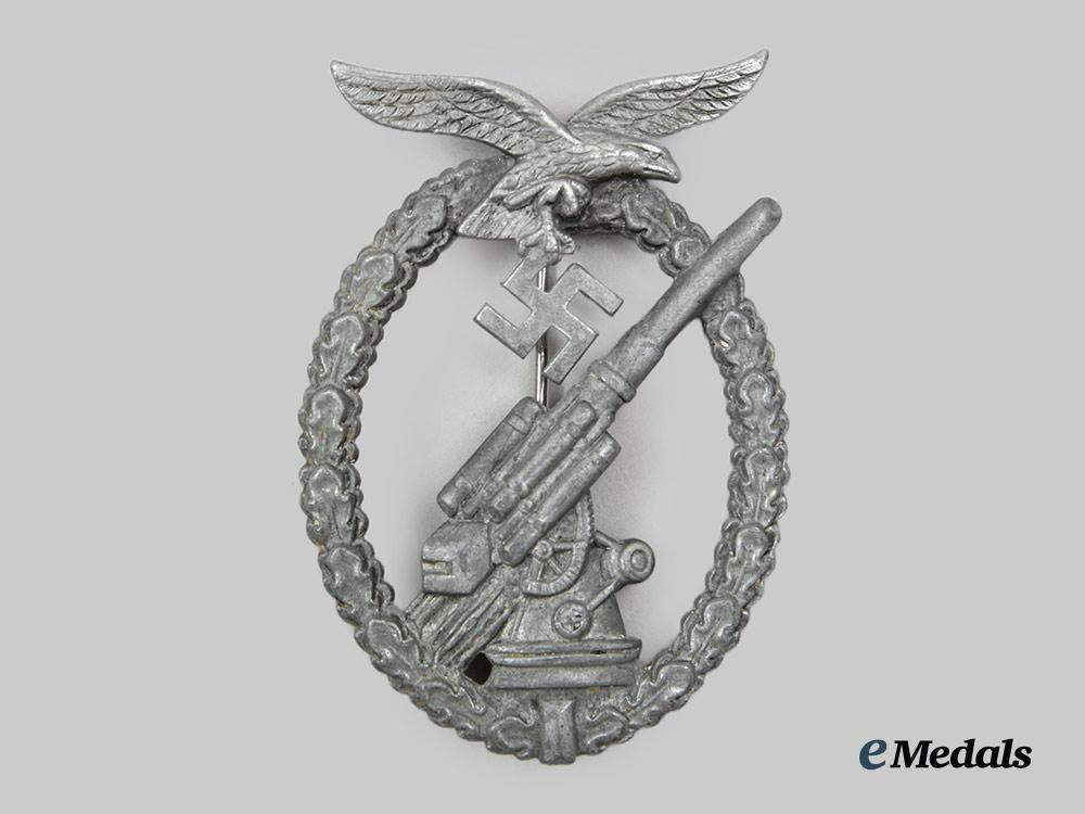(Flak-Kampfabzeichen der Luftwaffe). Constructed of silvered zink, the obverse consisting of an oval oak leaf wreath, joined together at the bottom by ribbon, topped by a Luftwaffe eagle clutching a mobile swastika, surrounding a central Flak 88 with its barrel raised and extending beyond the edge of the wreath, the reverse with a ball hinge and vertical pinback meeting a flat wire catch, unmarked but demonstrating the characteristics of a widely-document variant produced by an unidentified manufacturer, measuring 46.35 mm (w) x 66.62 mm (h), weighing 33.2 grams, demonstrating loss of silver finish throughout, a late-war example in better than very fine condition.