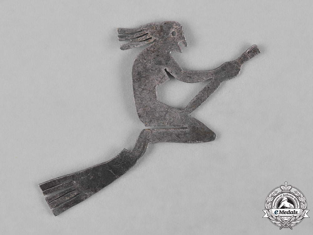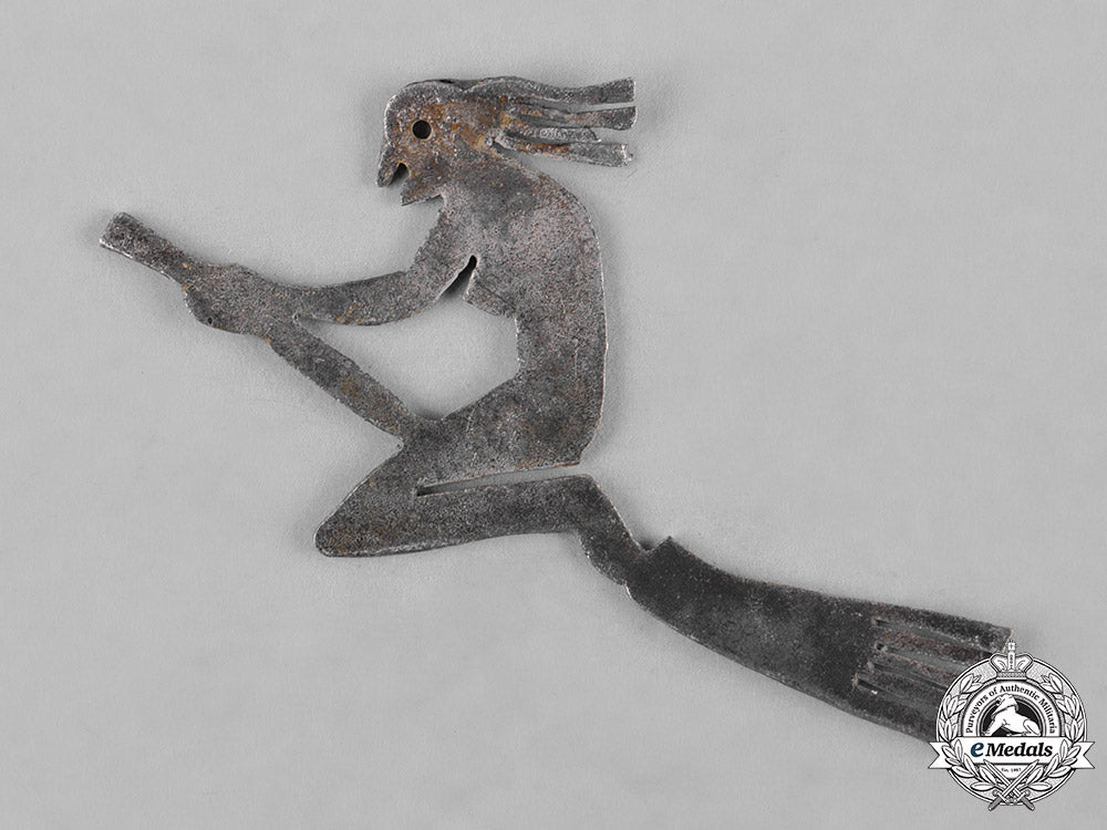 (Kappenabzeichen). A metal cap badge insignia presenting a witch riding a broomstick, measuring 50.98 mm (w) x 26.97 mm (h), and in good condition.