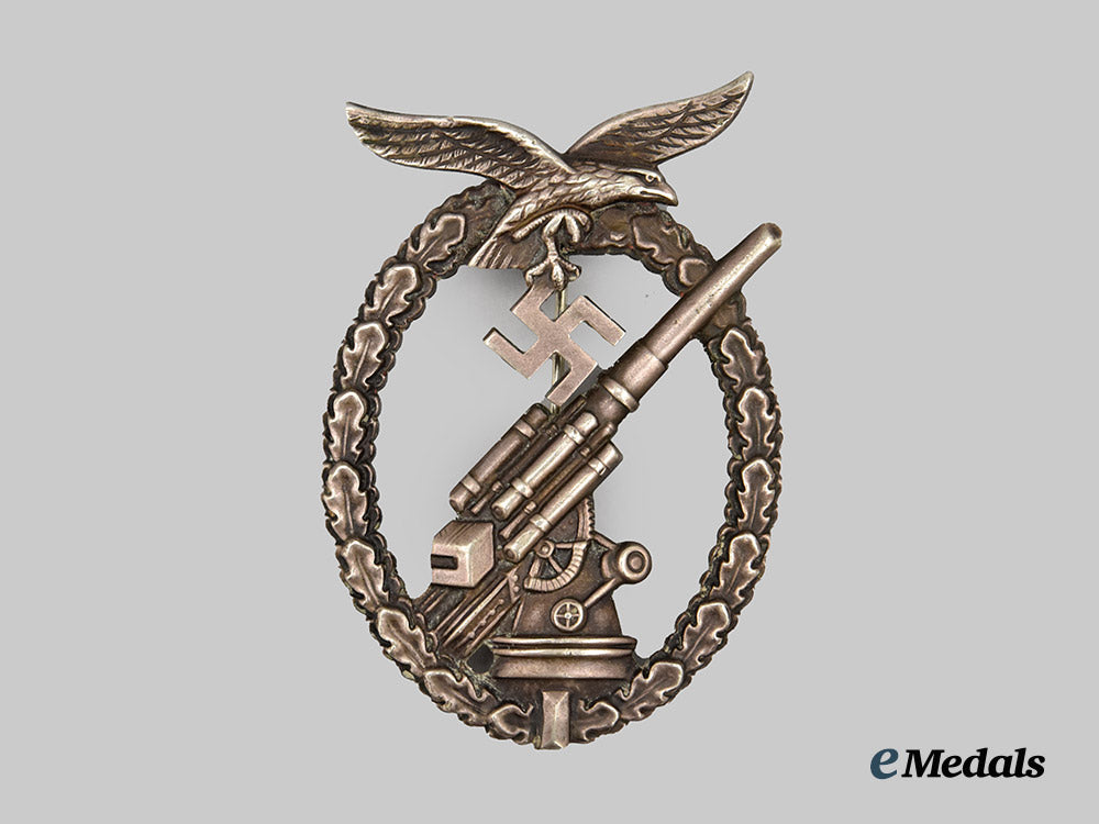 (Flak-Kampfabzeichen der Luftwaffe). Instituted July 18th, 1941. (c. 1942-1943). Constructed of “Neusilber” (nickel silver), the obverse consisting of an oval oak leaf wreath joined together at the bottom by ribbon, topped by a Luftwaffe eagle clutching a mobile swastika, surrounding a central Flak 88 with its barrel raised and extending beyond the edge of the wreath, the reverse with a crimped ball hinge, straight round wire pin, and crimped flat wire tombac catch, unmarked but displaying the “lizard head” eagle and dimple on the oak leaf immediately to the right of the bottom ribbon - both signature traits of this maker, measuring 46.2 mm (w) x 56.9 mm (l), weighing 39.53 grams, in better than extremely fine condition.