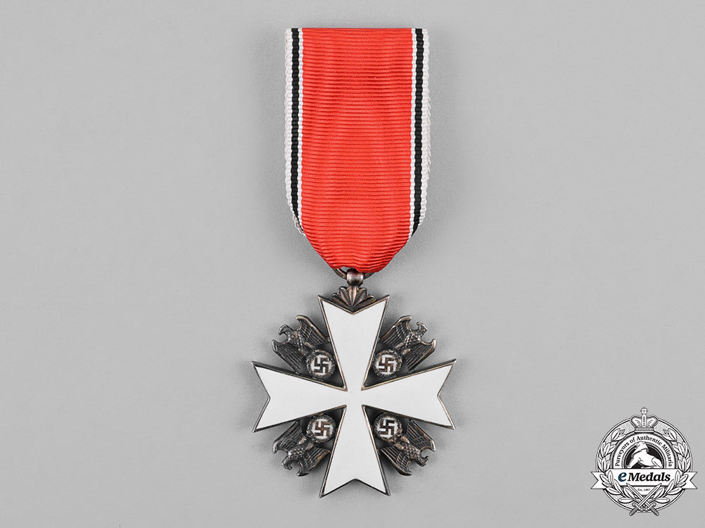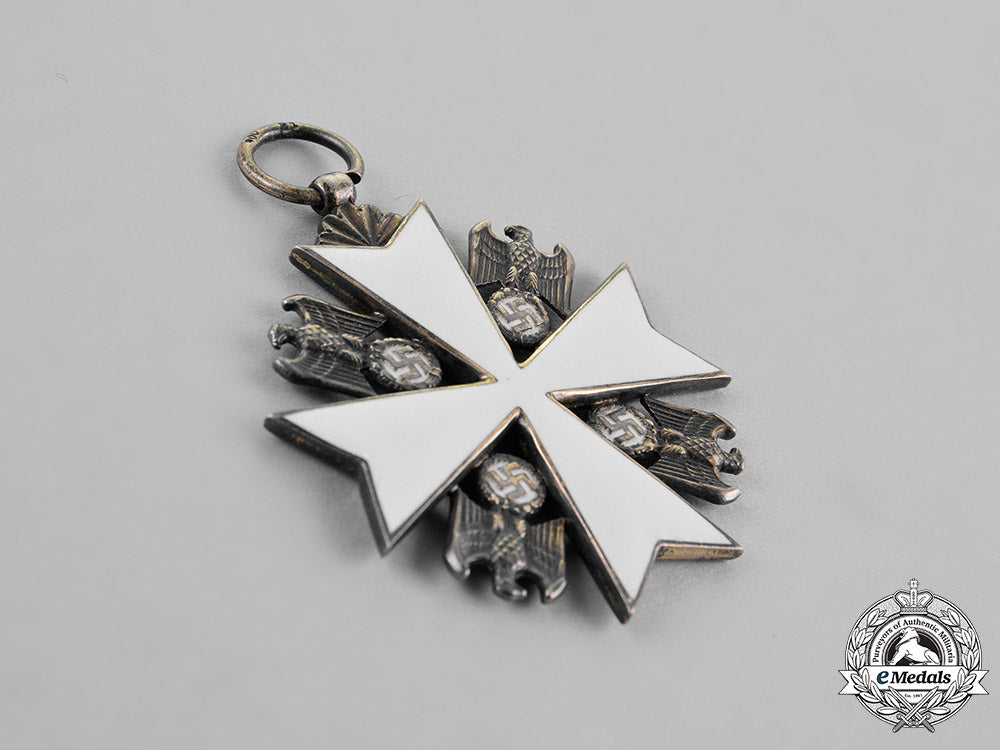 (Deutscher Adlerorden V. Klasse). Issued 1937-1945. Of multi-piece construction, consisting of a silver gilt Maltese cross with white enameled arms, with four national eagles (Hoheitszeichen) separately affixed between each arm of the cross; the obverse and reverse identical; on a loop for suspension - marked “900” for silver content, as well as “21” for “Godet & Co.”; with a correct replacement ribbon; measuring 45.14 mm (w) x 44.98 mm (h); weighing 18.2 grams; light flaking of the enamels; in overall better than very fine condition.