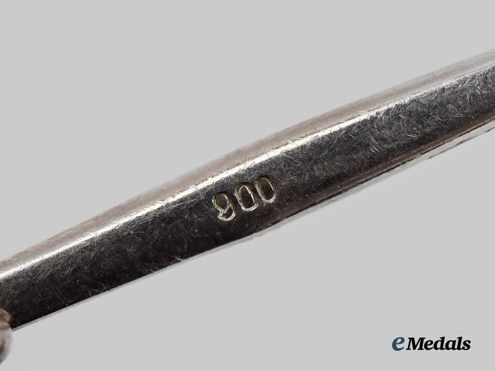 1. A sash cross, constructed silver with gilt and enamels, consisting of a Maltese Cross with white enameled arms joined through the quadrants by NSDAP-style German national eagles clutching wreathed mobile swastikas on white enameled discs, the twelve o’clock arm topped by a fan suspension culminating in an eyelet and ring retaining a period original full-length sash ribbon, the suspension loop stamped with a silver content number of “900”, otherwise unmarked but demonstrating the characteristics of manufacture by Gebrüder Godet, Berlin, measuring 59.04 mm (w) x 66.00 (h), weighing 39.5 grams, demonstrating minor flecking to the enamels, in extremely fine condition.