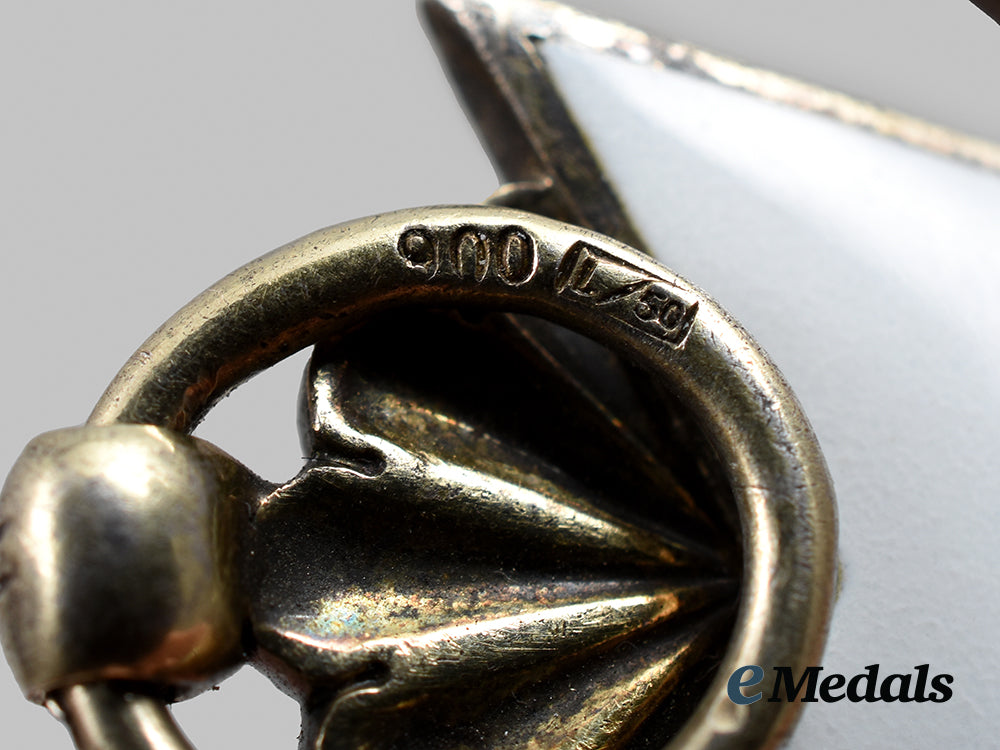 (Deutsches Adlerorden, Großkreuz mit Schwertern). Instituted 1 May 1937. (1939-1943 issue). Constructed of gilded silver with enamels, consisting of a Maltese Cross with white enameled arms, joined together through the quadrants by NSDAP-style German national eagles clutching wreathed mobile swastikas on white enameled discs, the obverse overlaid across the three and nine o’clock arm with a pair of crossed swords, the twelve o’clock arm topped by a fan suspension culminating in a loop and ring, the latter maker marked with LDO code “L/50” indicating a privately-purchased example produced Gebrüder Godet, Berlin, flanked by a silver content number of “900”, measuring 59.77 mm (w) x 67.26 mm (h), weighing 39.0 grams, accompanied by a length of sash ribbon missing its rosette and spring clip, demonstrating minor flecking to the enamels and moderate loss of gilt finish throughout the base metal, a scarce and jeweller-quality example in extremely fine condition.