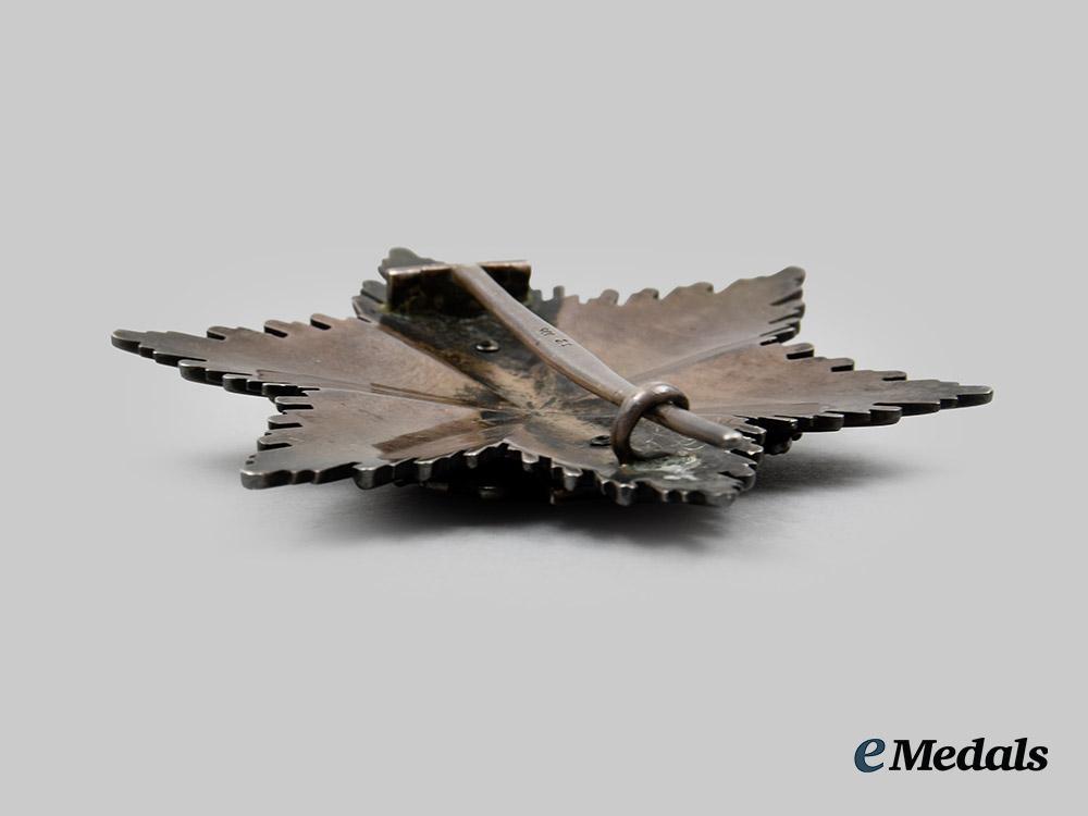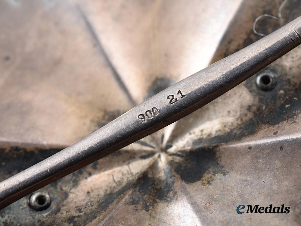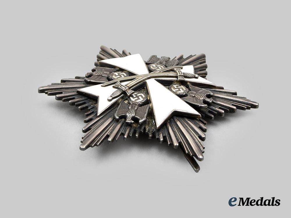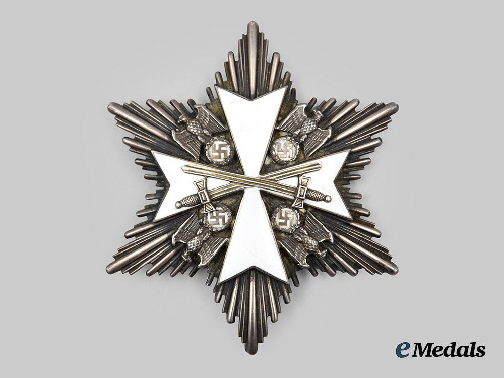 (Verdienstorden vom Deutschen Adler, Bruststern II. Klasse mit Schwertern). Instituted 1 May 1937. (1943-1945 issue). Constructed of silver with enamels, the obverse consisting of a six-pointed radiant star, bearing a central white enameled Maltese Cross, with its arms joined through the quadrants by NSDAP-stye German national eagles clutching wreathed mobile swastikas on white enameled discs, overlaid across the three and nine o’clock arms by a crossed sword clasp, the reverse with two blasted rivets securing the obverse applique in position, with a wide barrel hinge and tapering vertical pinback meeting a rounded catch, the pinback maker marked with Präsidialkanzlei code “21” for Gebrüder Godet, Berlin, in turn flanked by a silver content number of “900”, measuring 65.42 mm (w) x 75.30 mm (h), weighing 54.4 grams, the cross has loosened from the underlying star but remains firmly attached, while the silver base demonstrates a consistent patina throughout, a wartime example in very fine condition.