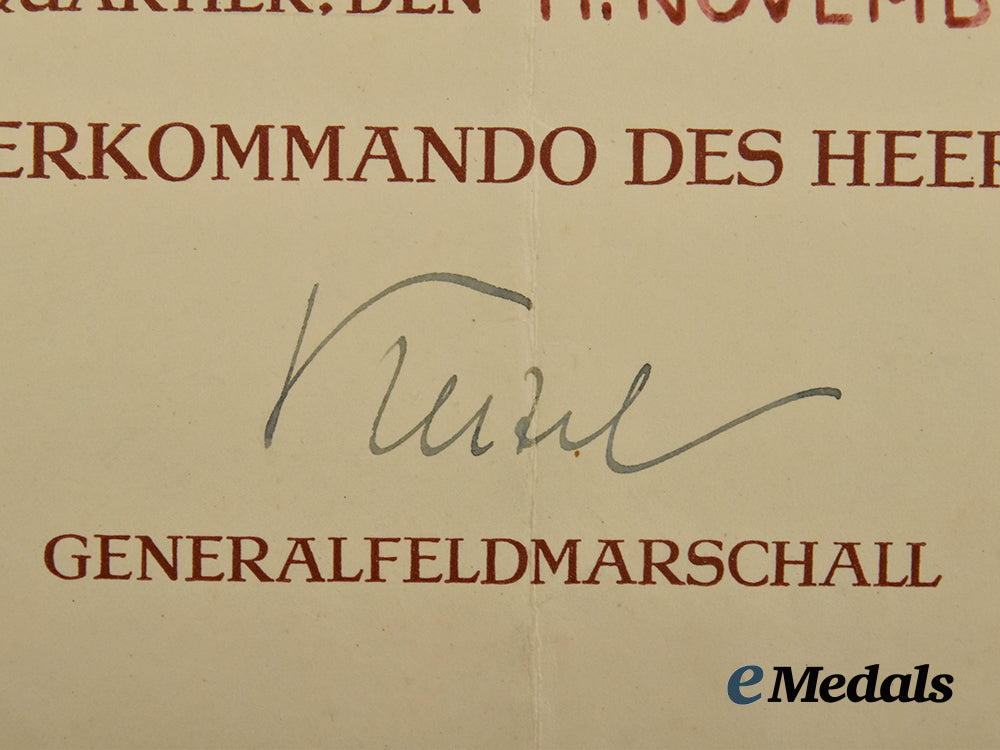 (Verdienstorden vom Deutschen Adler, Kreuz III. Klasse mit Etui). Instituted 1 May 1937. (1939-1943 issue). Constructed of gilded silver with enamels, consisting of a Maltese Cross with white enameled arms, joined through the quadrants by NSDAP-style German national eagles clutching wreathed mobile swastikas on white enameled discs, the twelve o’clock arm with a fan suspension and integral loop retaining a suspension ring accommodating an original full-length neck ribbon, the suspension loop bearing a silver content number of “900”, otherwise unmarked but demonstrating the characteristics of manufacture by Gebrüder Godet, Berlin, measuring 50.35 mm (w) x 58.67 mm (h), weighing 30.2 grams, accompanied by its original presentation case, constructed of a wooden frame with a faux red leather exterior liner, the lid bearing a gilt German national eagle clutching a wreathed mobile swastika, the interior with a white rayon lid liner and intact hinge cover, the former bearing a gilt inscription of “VERDIENSTKREUZ I. STUFE DES ORDENS VOM DEUTSCHEN ADLER”, with a depressed black velvet medal bed, closing with a functional metal snap button, unmarked, measuring 14 cm (w) x 18 cm (l) x 3 cm (h), minor flecking is visible to the enamels of the decoration while the exterior of the case demonstrates moderate material fatigue, in overall near extremely fine condition.