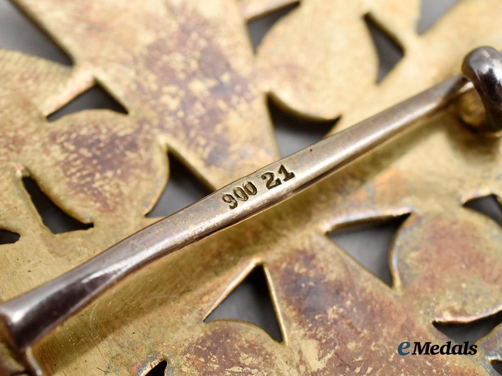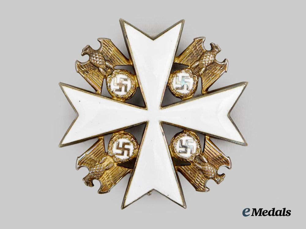 (Verdienstorden vom Deutschen Adler, Kreuz IV. Klasse). Instituted 1 May 1937. (1943-1945 issue). Constructed of gilded silver with enamels, consisting of a vaulted Maltese Cross, the obverse with white enameled arms joined through the quadrants by NSDAP-style German national eagles clutching wreathed mobile swastikas on white enameled discs, the reverse with a wide barrel hinge and tapering vertical pinback meeting a rounded catch, the pinback maker marked with Präsidialkanzlei code “21” for Gebrüder Godet, Berlin, and a silver content number of “900”, measuring 49.22 mm (w) x 49.81 mm (h), weighing 30.1 grams, demonstrating minor flecking to the enamels, a superb wartime example demonstrating the Godet firm’s noted quality in extremely fine condition.