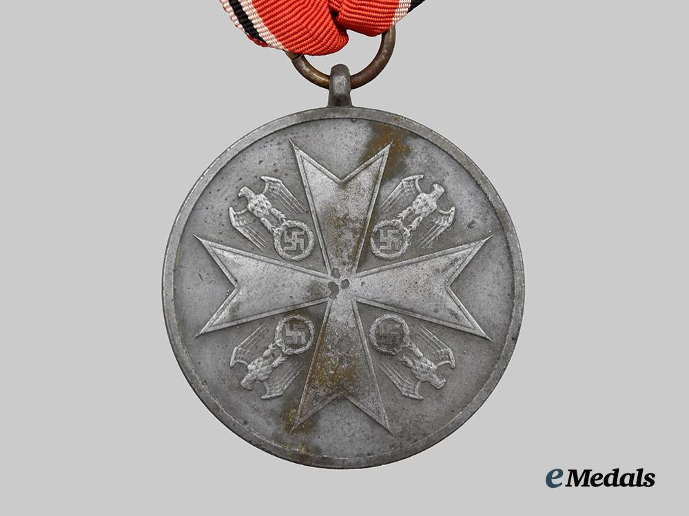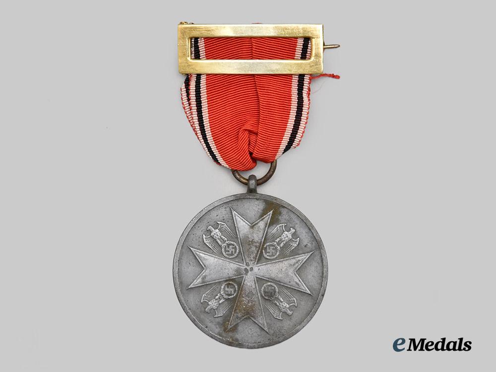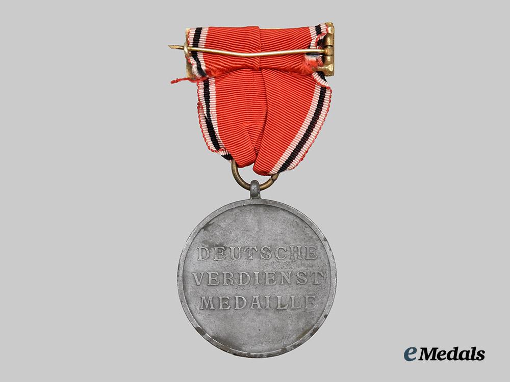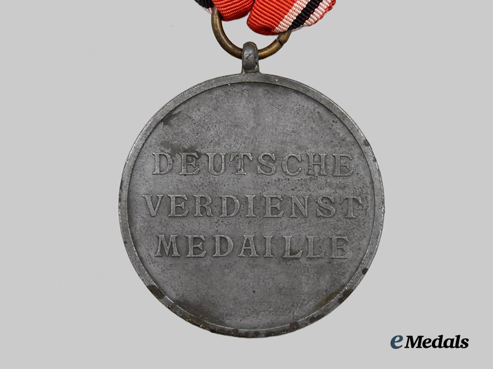 (Deutsche Verdienstmedaille in Bronze). Instituted 1 May 1937. (1937-1945 issue). Constructed of bronzed zink, on loop for suspension with its period original ribbon affixed to a classic Spanish-style bronze buckle indicating issue to a foreign recipient, the obverse bearing a raised Maltese Cross with pebbled arms joined through the quadrants by NSDAP-style German national eagles clutching wreathed mobile swastikas, the reverse bearing a raised inscription of “DEUTSCHE VERDIENST MEDAILLE” (“GERMAN MERIT MEDAL”), unmarked, measuring 38.62 mm in diameter, weighing 23.0 grams (inclusive of ribbon), demonstrating near-total loss of bronze finish, in very fine condition.