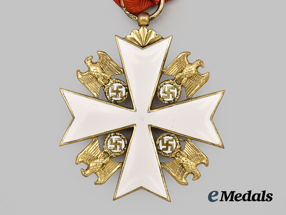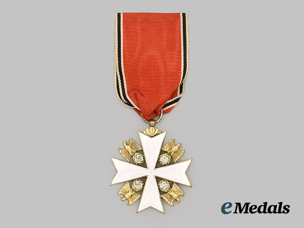 (Verdienstorden vom Deutschen Adler, Kreuz V. Klasse mit Schwertern). Instituted 1 May 1937. (1943-1945 issue). Constructed of gilded silver with enamels, consisting of a Maltese Cross with white enameled arms, joined through the quadrants by gilded NSDAP-style German national eagles clutching wreathed mobile swastikas on white enameled discs, the obverse overlaid across the three and nine o’clock arms with gilt crossed swords, the twelve o’clock arm topped by a fan suspension with an integral loop and ring retaining a period original ribbon, the suspension ring marked with a silver content number of “900” and a Präsidialkanzlei code of “21” indicating manufacture by Gebrüder Godet, Berlin, measuring 44.84 mm (w) x 51.14 mm (h), weighing 23.2 grams, demonstrating minor flecking to the enamels, a superb example demonstrating Godet’s noted jeweller quality in extremely fine condition.