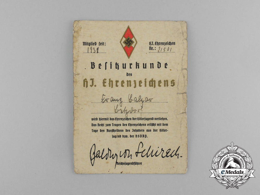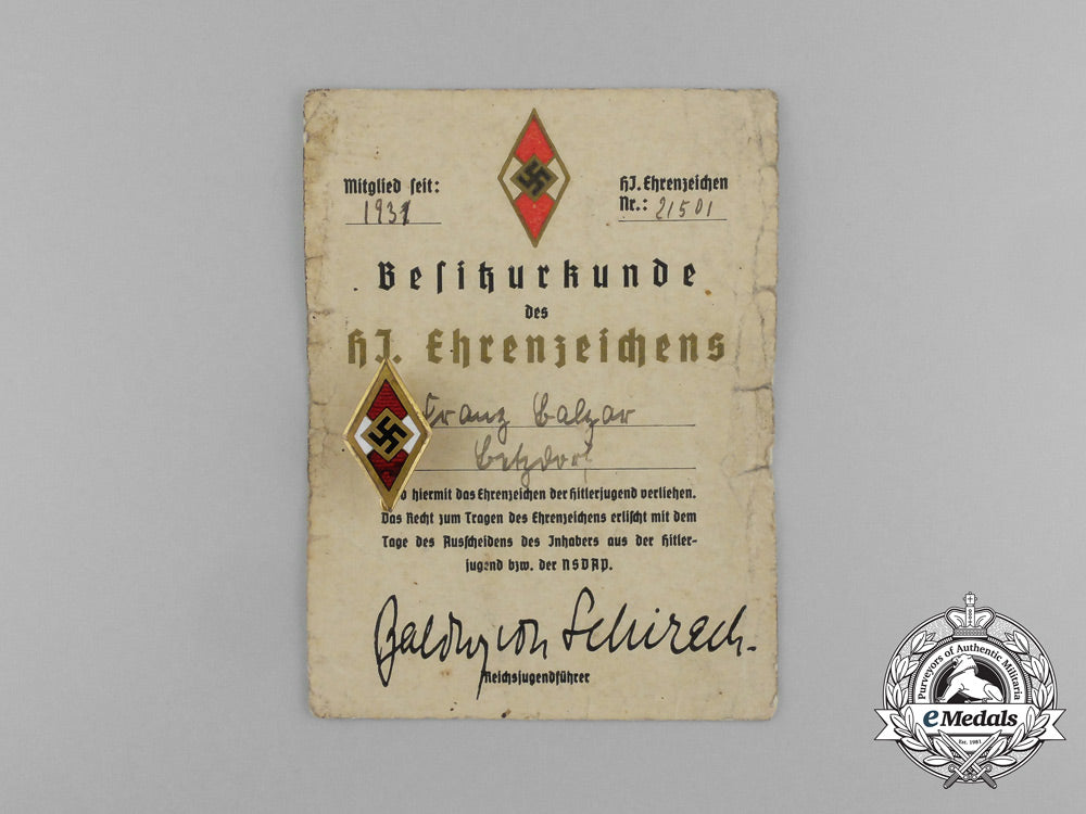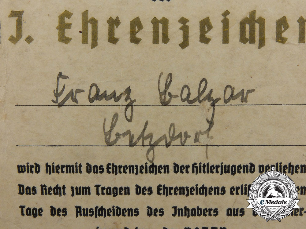 A Golden Hj Honour Badge & Award Certificate Presented To Franz Balzar