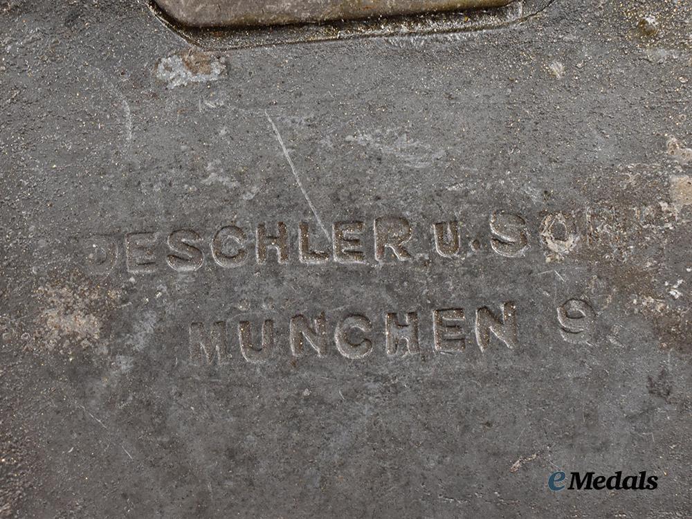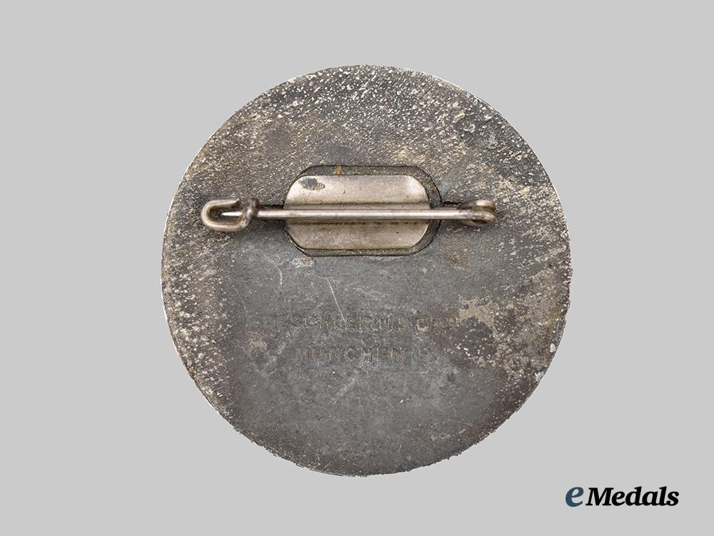 (HJ Italienfahrt Erinnerungsabzeichen). Constructed of silvered zink, the obverse bearing a raised and leftward-facing profile of AH, circumscribed by an inscription of “ITALIENFAHRT DER HJ SEPTEMBER 1936” (“ITALIAN EXCURSION OF THE HJ SEPTEMBER 1936”), the reverse with a horizontal pinback, maker marked “DESCHLER & SOHN, MÜNCHEN”, measuring 40 mm in diameter, demonstrating near-total loss of silver finish to the base metal, in very fine condition.