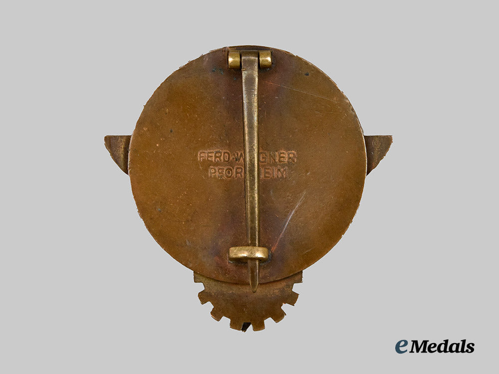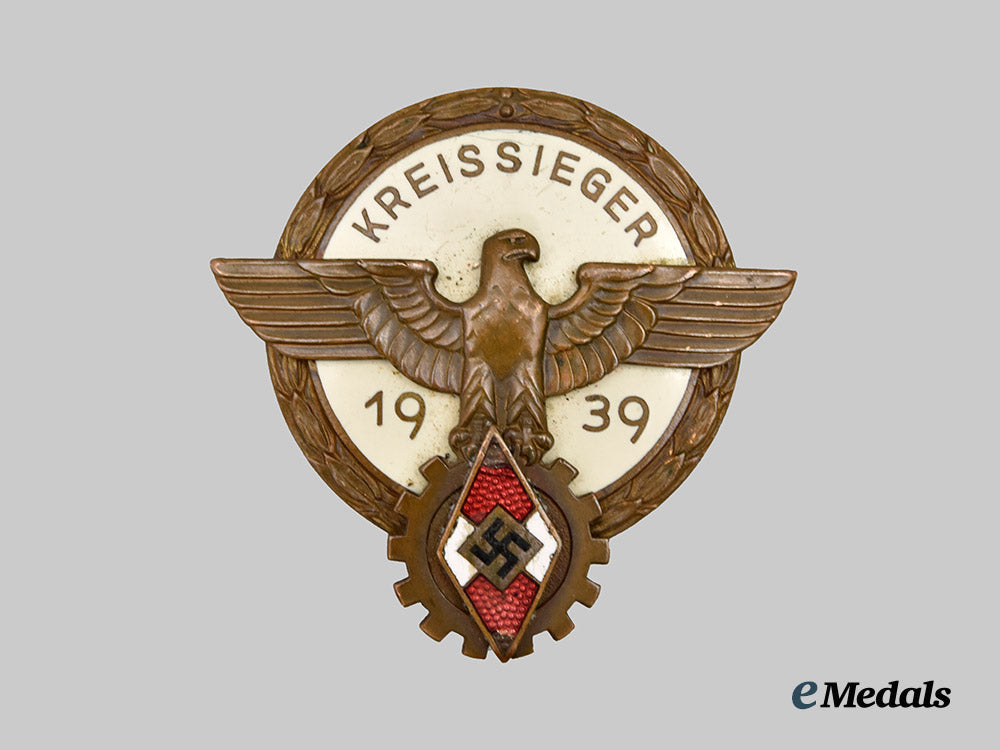 (Ehrenzeichen Kreissieger im Reichsberufswettkampf). Constructed of bronze with multi-coloured enamels, the obverse consisting of a circular laurel leaf wreath, surrounding a white enameled disc, overlaid by a German national eagle clutching a cogwheel, in turn defaced by an enameled HJ insignia, the eagle circumscribed by an inscription of “KREISSIEGER” (“DISTRICT VICTOR”) and a date of “1939”, the reverse with a raised barrel hinge and vertical pinback meeting a flat wire catch, maker marked “FERD. WAGNER, PFORZHEIM”, measuring 48.85 mm (w) x 48.04 mm (h), weighing 28.6 grams, demonstrating minor flecking and loss of finish to the enamels and base metal, respectively, demonstrating some flecking to the enamels with minor and sporadic chipping to the HJ insignia, with evidence of re-attachment of the latter, in better than very fine condition.