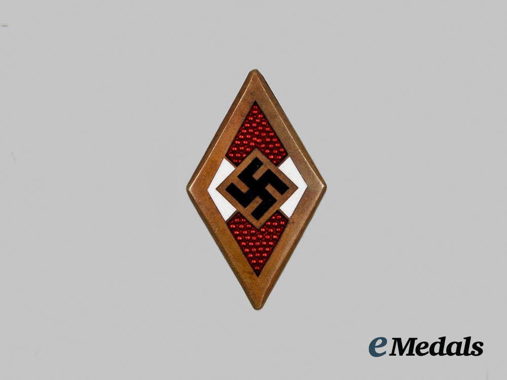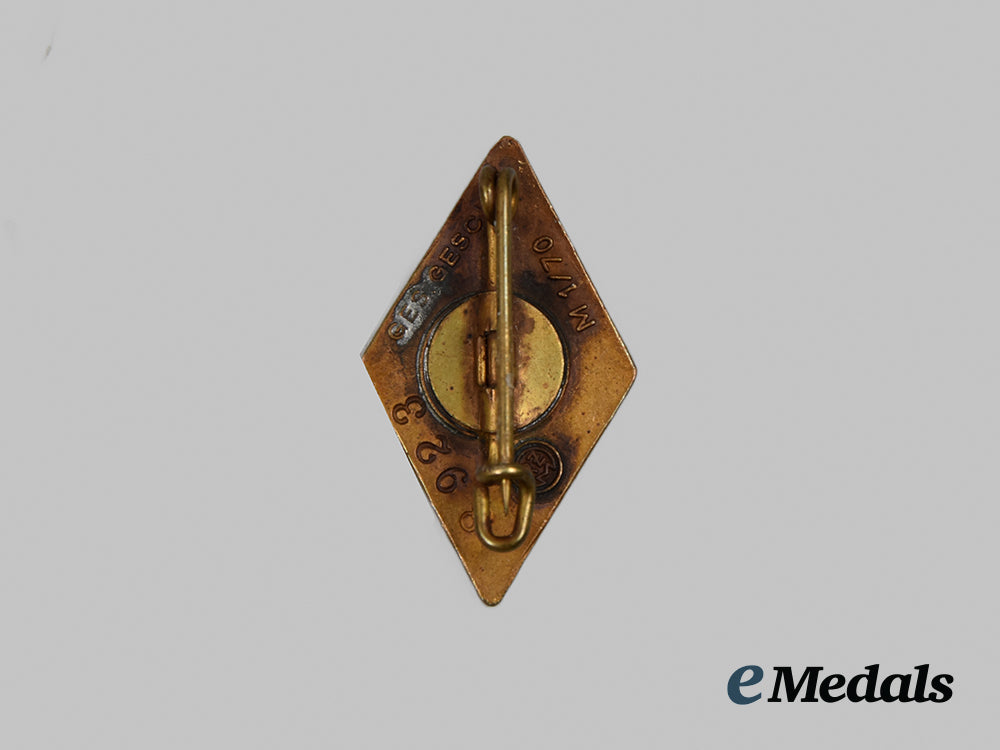 (Goldenes Ehrenzeichen der HJ). Constructed of gilded tombak with multi-coloured enamels, the obverse consisting of an enameled HJ insignia situated within a gilt border, the reverse with a vertical pinback, stamped with an award number of “8923”, also marked with a Reichszeugmeisterei (RZM) logo and maker code “M1/70” for Franz Otto, Wuppertal-Elberfeld, measuring 16.86 mm (w) x 28.96 mm (h), weighing 3.7 grams, demonstration loss of gilt finish, in extremely fine condition.