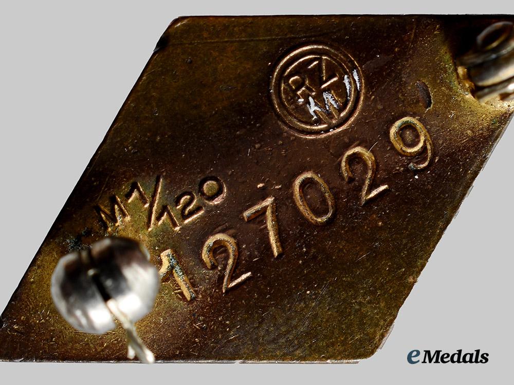 (Goldenes HJ-Ehrenzeichen). Constructed of gilded bronze with multi-coloured enamels, the obverse consisting of a multi-coloured enameled HJ insignia situated within a gilded border, the reverse with a clip hinge and vertical pinback meeting a locking catch, stamped with an award number of “127029” and marked with a Reichszeugmeisterei (RZM) logo, alongside a maker’s code of “M1/120” for Wilhelm Deumer, Lüdenscheid, measuring 16.86 mm (w) x 28.37 mm (h), weighing 3.6 grams, demonstrating some flecking and loss of gilt finish to the enamels and base metal, respectively, a primary award badge in near extremely fine condition.