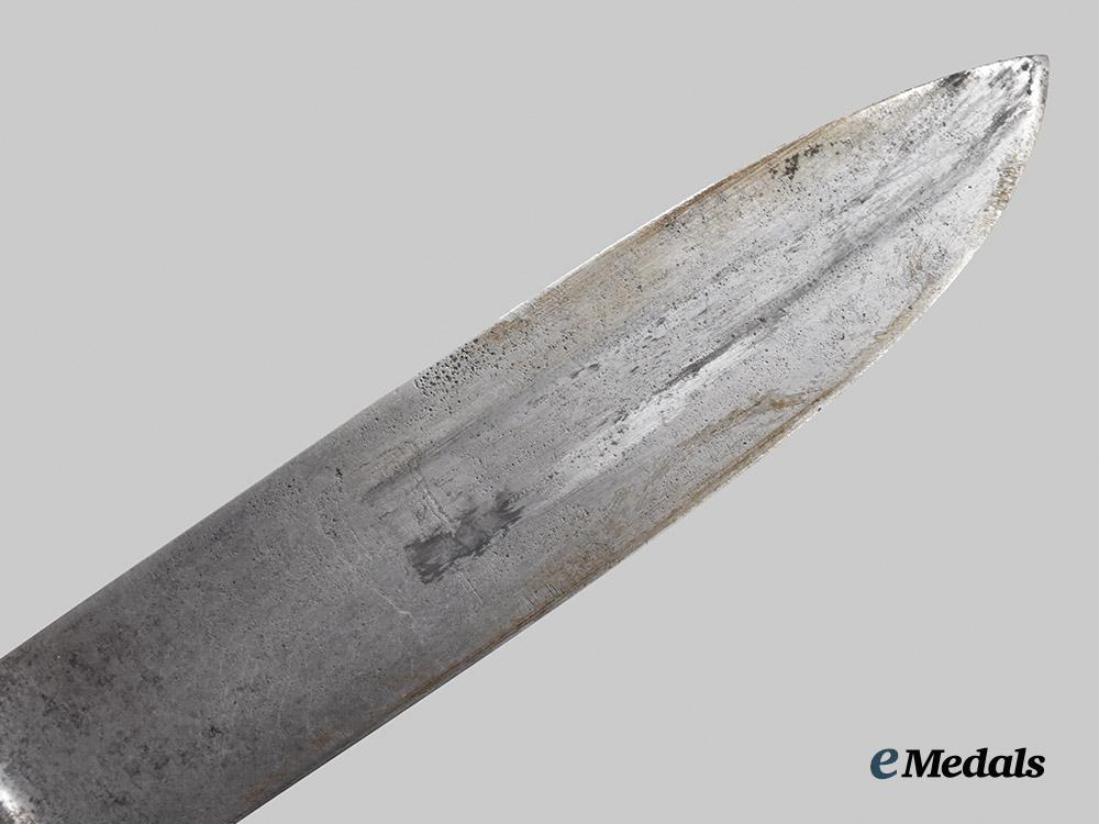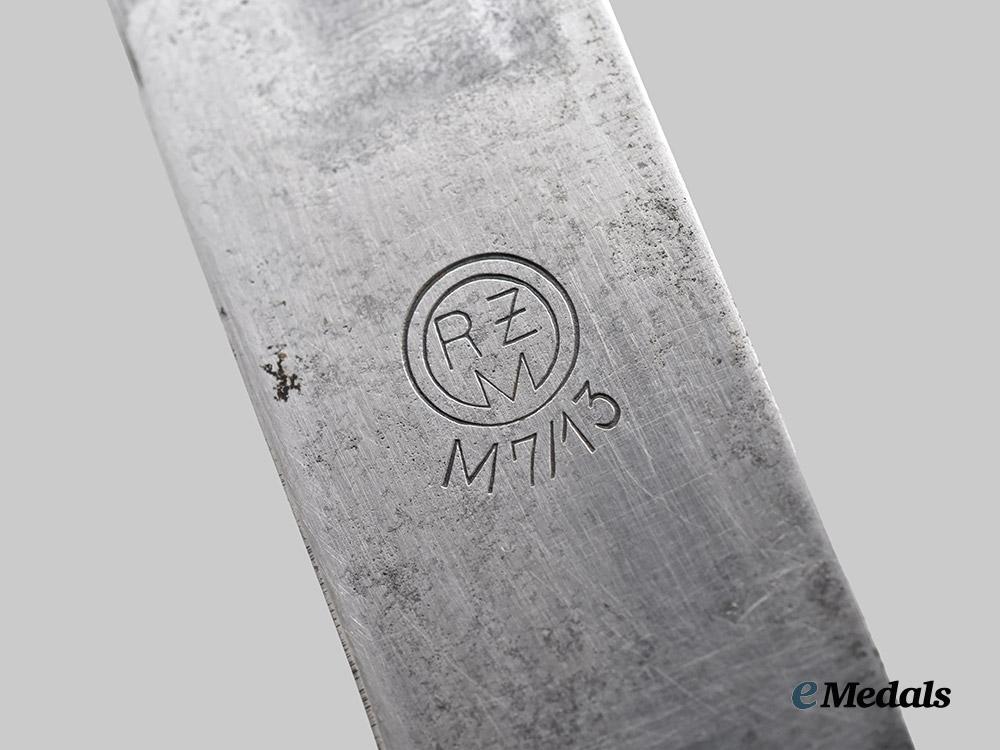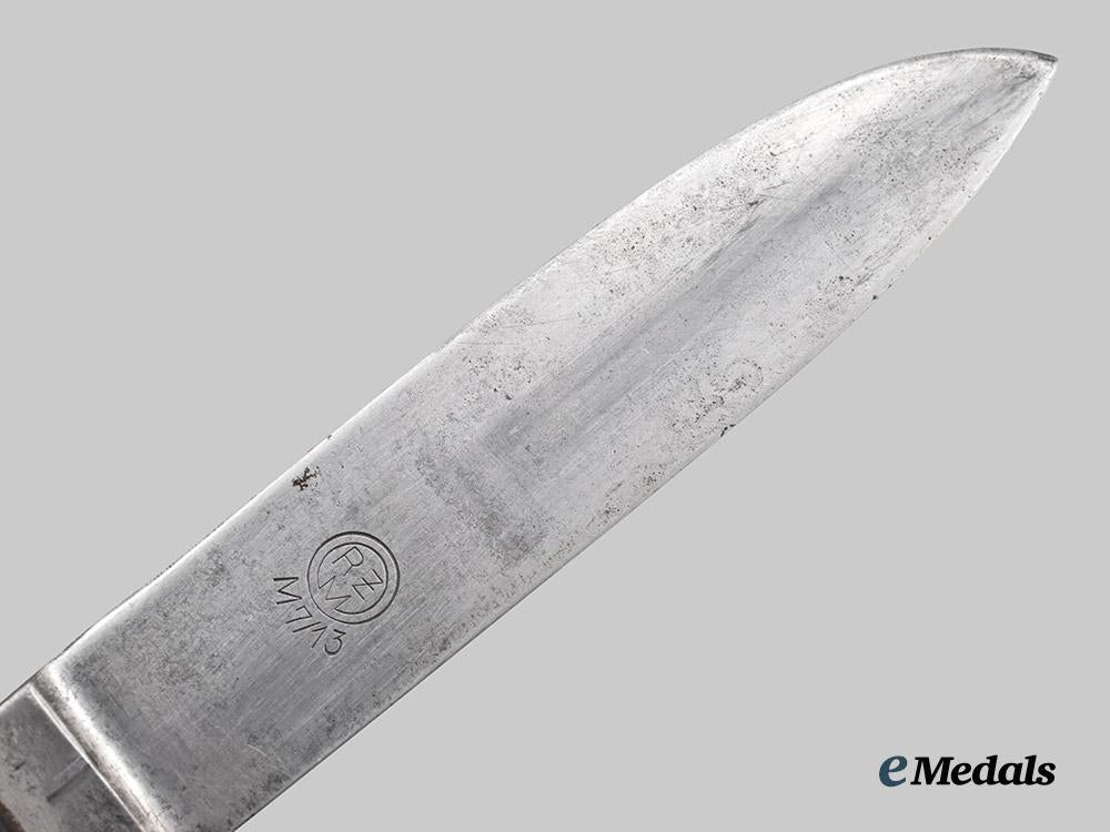 (HJ Fahrtenmesser). A well-preserved HJ member’s knife, measuring 25.5 cm in total length when inserted into the scabbard. It features a 14.5 cm-long, nickel-plated, magnetic steel blade which retains factory-original sharpening to both the tip and lower edge. The reverse of the blade is marked with a Reichszeugmeisterei (RZM) logo and maker code “M1/13” for Arthur Schüttelhöfer, Solingen. It sits securely within a nickel-plated non-magnetic metal alloy hilt with a hooked quillon and pommel, with an intact blackened leather buffer pad covering the seam. Two pieces of pebbled black bakelite compose the handle grip, and are fastened in place with dual magnetic metal rivets. Inset into the obverse of the handle is an enameled HJ insignia measuring 15 mm (w) 25 mm (h). Accompanying the knife is its original scabbard, constructed of a black painted magnetic metal shaft. Riveted to the reverse is a blackened leather strap, fastened into a loop for belt suspension, which retains a functional snap button to restrain the knife in place during storage. A functional spring catch situated within the throat firmly holds the blade within the scabbard. Issues consistent with age and wear are evident, and include running marks and tarnishing throughout the blade, loss of nickel plating to the hilt, and age-appropriate material fatigue to the leather elements. This late-period knife remains in an overall better than very fine condition.