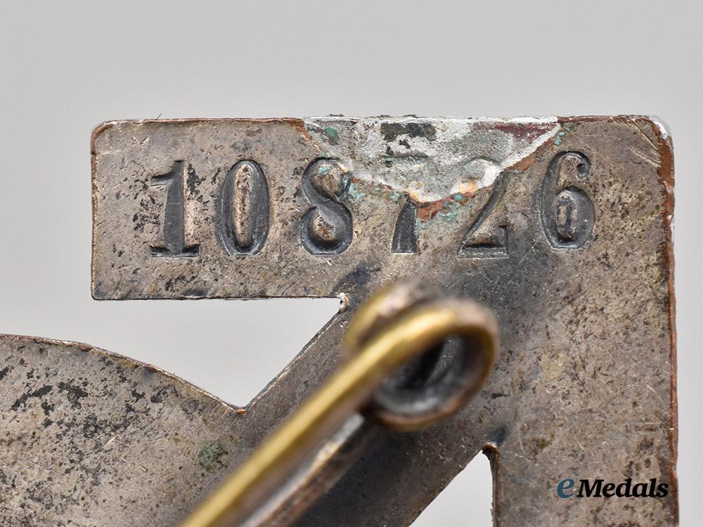 1. A Silver Grade award, constructed of cupal, the obverse consisting of a Tyr rune, bearing a central mobile swastika, surrounded by a circular ring bearing an inscription of “FÜR LEISTUNGEN IN DER H.J.” (“FOR MERIT IN THE H.J.”), the reverse with a vertical pinback, stamped with an award number of “108726”, marked with a Reichszeugmeisterei (RZM) logo and maker code “M1/63” Steinhauer & Lück, Lüdenscheid, measuring 29 mm (w) x 52 mm (h), demonstrating moderate loss of finish, in very fine condition.
