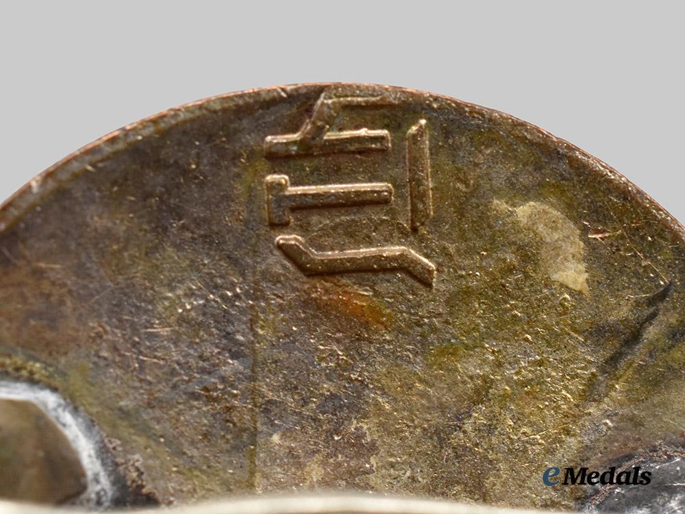 (Der Stahlhelm Diensteintrittsabzeichen 1920). Instituted 13 November 1933 by Franz Seldte. (1933-1939 issue). Constructed of silvered tombak with enamels, the obverse consisting of a black enameled medallion, overlaid by a raised Stahlhelm insignia, situated above a silvered date of “1920” topped by oak leaves, the reverse with a crimped hinge and tapering vertical pinback meeting a flattened catch, maker marked with the logo of Der Stahlhof, Magdeburg, measuring 30.21 mm in diameter, weighing 10.9 grams, surface chipping is visible to the enamels and both the hinge and catch demonstrate evidence of period repair, in very fine condition.