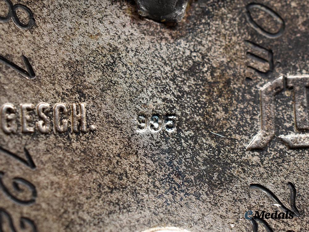 (Der Stahlhelm Diensteintrittsabzeichen 1922). Instituted 13 November 1933 by Franz Seldte. (1933-1939 issue). Constructed of silver with enamels, the obverse consisting of a black enameled medallion, overlaid by a raised Stahlhelm insignia, situated above a silvered date of “1922” topped by oak leaves, the reverse with a crimped hinge and tapering vertical pinback meeting a round wire catch emanating from a circular plate, engraved with a unit attribution of “III. OM. 72” and service entry date of “18. 1. 1922”, maker marked with the logo of Der Stahlhof, Magdeburg, stamped with a silver content number of “935”, measuring 30.45 mm in diameter, weighing 12.5 grams, demonstrating minor flecking to the enamels, in extremely fine condition.