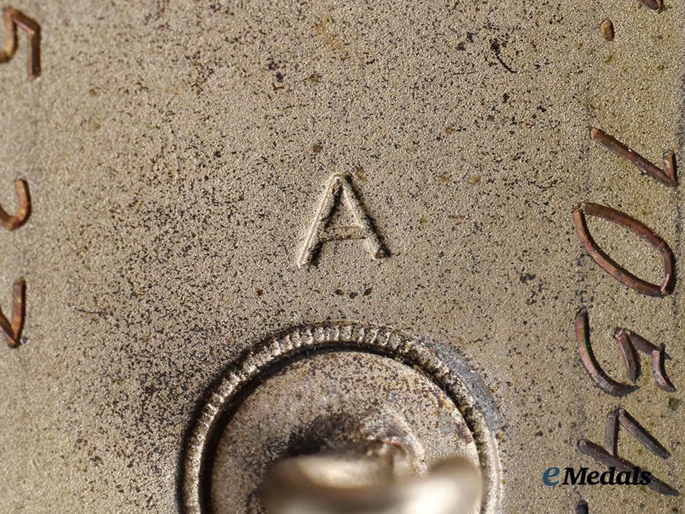 (Der Stahlhelm Diensteintrittsabzeichen 1923). Instituted 13 November 1933 by Franz Seldte. (1933-1939 issue). Constructed of silvered tombak with enamels, the obverse consisting of a black enameled medallion, overlaid by a raised Stahlhelm insignia, situated above a silvered date of “1923” topped by oak leaves, the reverse with a crimped hinge and tapering vertical pinback meeting a round wire catch emanating from a circular plate, engraved with a unit attribution of “III. OM.1054.” and service entry date of “28. 5. 23”, maker marked with the logo of Der Stahlhof, Magdeburg, measuring 30.50 mm in diameter, weighing 11.0 grams, demonstrating minor flecking to the enamels, in extremely fine condition.