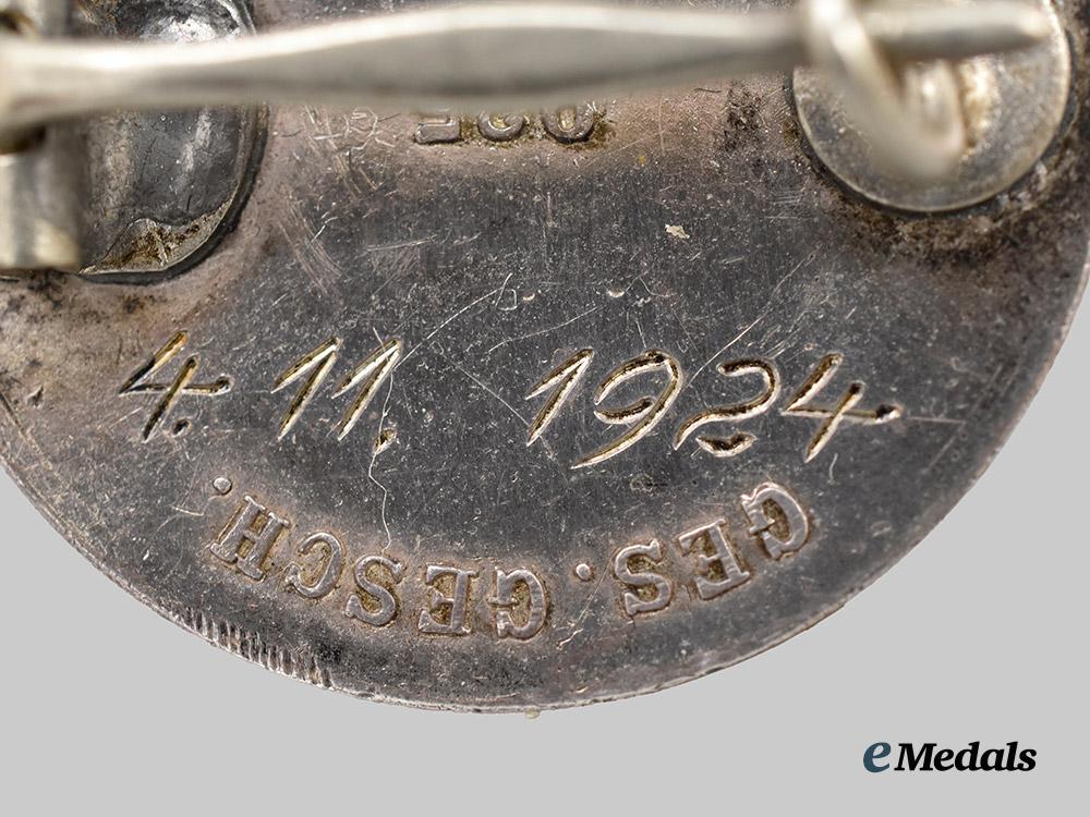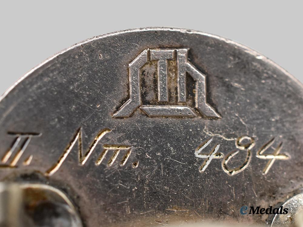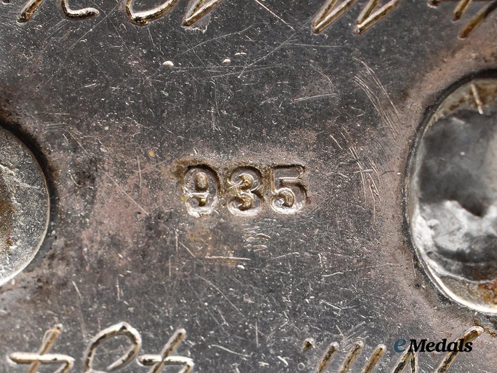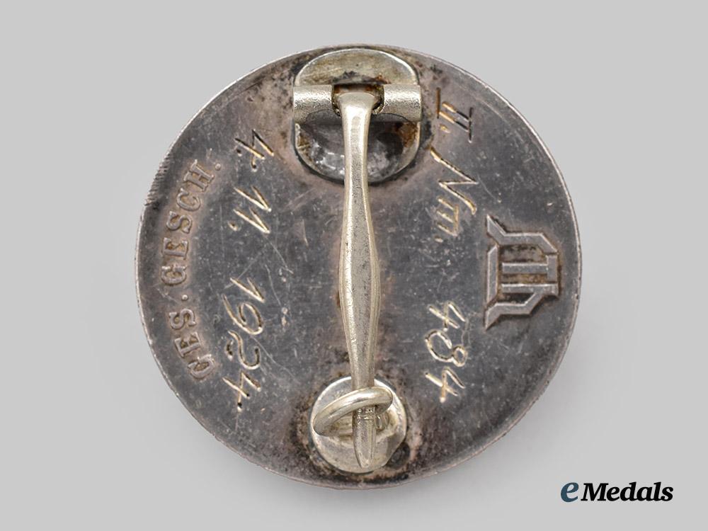 (Der Stahlhelm Diensteintrittsabzeichen 1924). Instituted 13 November 1933 by Franz Seldte. (1933-1939 issue). Constructed of silver with enamels, the obverse consisting of a black enameled medallion, overlaid by a raised Stahlhelm insignia, situated above a silvered date of “1924” topped by oak leaves, the reverse with a crimped hinge and tapering vertical pinback meeting a round wire catch emanating from a circular plate, engraved with a unit attribution of “II. NM. 484” and service entry date of “4. 11. 1924”, maker marked with the logo of Der Stahlhof, Magdeburg, stamped with a silver content number of “935”, measuring 30.62 mm in diameter, weighing 15.0 grams, demonstrating minor flecking to the enamels, in extremely fine condition.