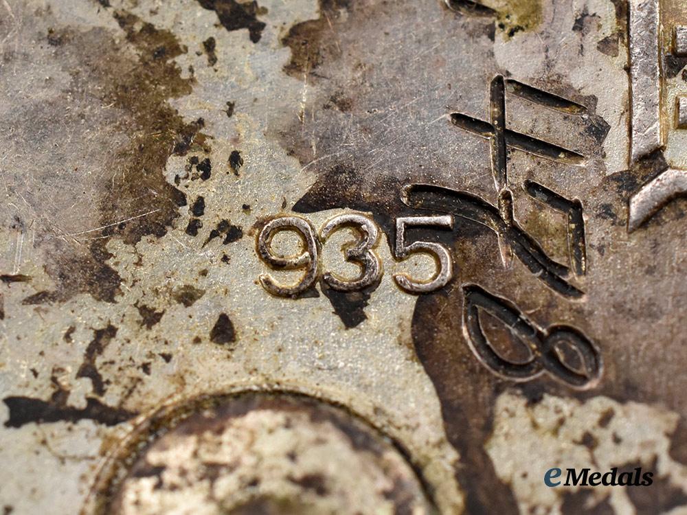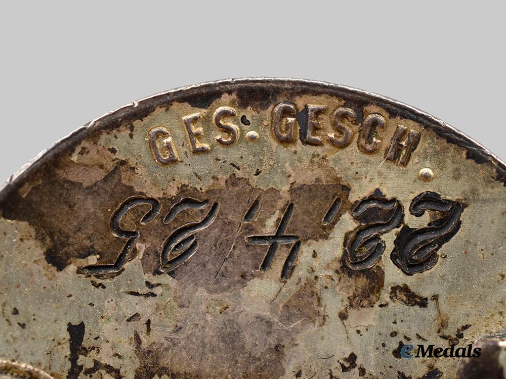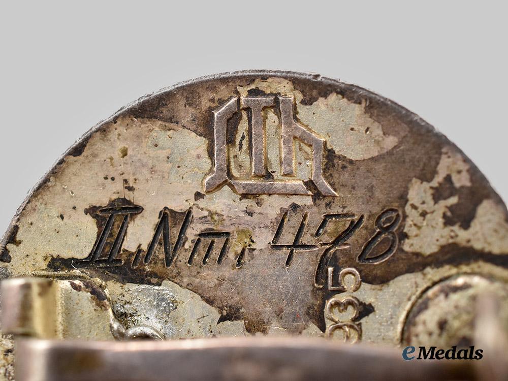 (Der Stahlhelm Diensteintrittsabzeichen 1925). Instituted 13 November 1933 by Franz Seldte. (1933-1939 issue). Constructed of silver with enamels, the obverse consisting of a black enameled medallion, overlaid by a raised Stahlhelm insignia, situated above a silvered date of “1925” topped by oak leaves, the reverse with a crimped hinge and tapering vertical pinback meeting a round wire catch emanating from a circular plate, engraved with a unit attribution of “II. NM. 478” and service entry date of “28. 4. 25”, maker marked with the logo of Der Stahlhof, Magdeburg, stamped with a silver content number of “935”, measuring 30.69 mm in diameter, weighing 13.1 grams, demonstrating minor flecking to the enamels, in extremely fine condition.