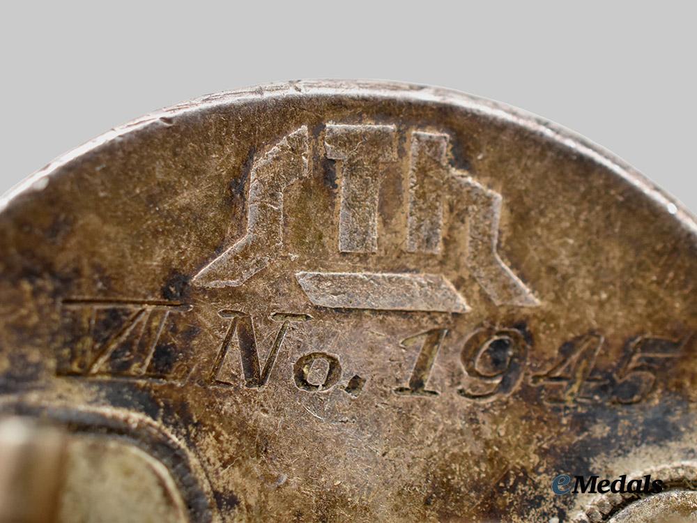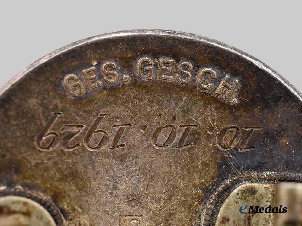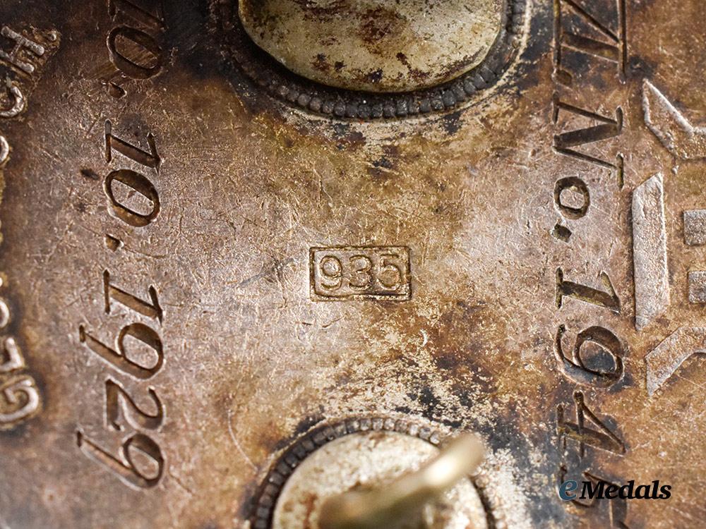 (Der Stahlhelm Diensteintrittsabzeichen 1929). Instituted 13 November 1933 by Franz Seldte. (1933-1939 issue). Constructed of silver with enamels, the obverse consisting of a black enameled medallion, overlaid by a raised Stahlhelm insignia, situated above a silvered date of “1929” topped by oak leaves, the reverse with a crimped hinge and tapering vertical pinback meeting a round wire catch emanating from a circular plate, engraved with a unit attribution of “B 476” and service entry date of “10. 10. 1929”, maker marked with the logo of Der Stahlhof, Magdeburg, stamped with a silver content number of “935”, measuring 30.38 mm in diameter, weighing 14.4 grams, demonstrating minor flecking to the enamels and a consistent patina throughout the silver base, in near extremely fine condition.