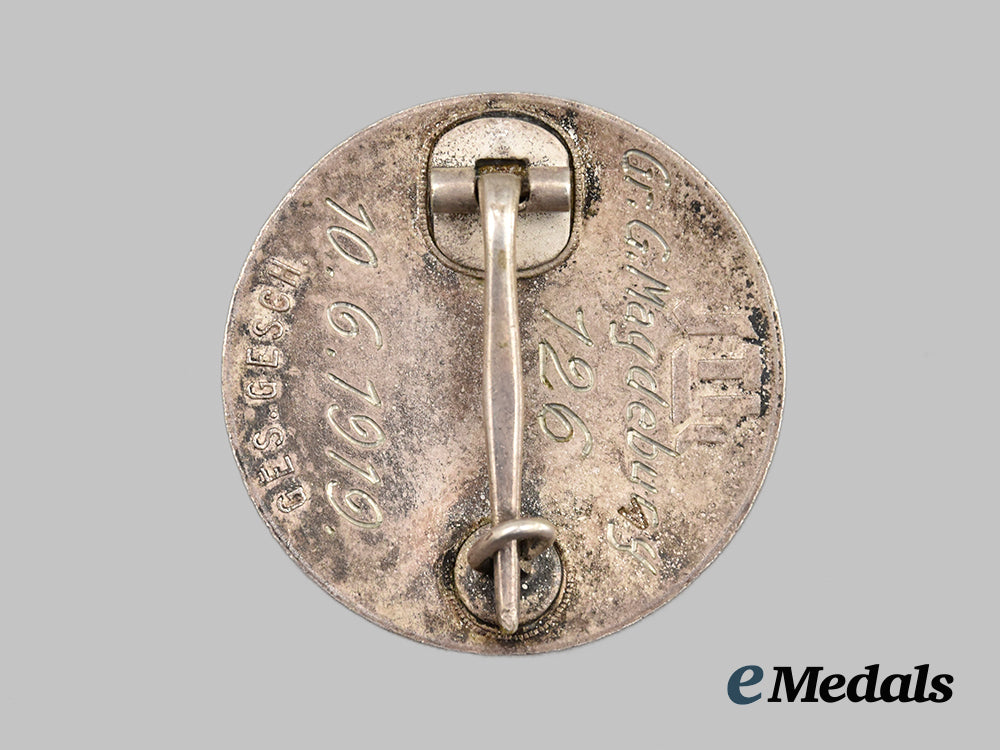 (Diensteintritts-und Traditionsabzeichen Stahlhelmbund 1919). Instituted 13 November 1933 by Franz Seldte. (1933-1939 issue). Constructed of silvered tombak with enamels, the obverse consisting of a black enameled disc, overlaid by a raised and silvered Stahlhelm insignia, situated above a pair of silvered oak leaves and date of “1919”, the revere with a crimped hinge and narrow tapering pinback meeting a rounded catch, bearing an etched unit dedication of “GR. G. MAGDEBURG 126” and service commencement date of “10. 6. 1919.”, maker marked with the logo of Der Stahlhof, Magdeburg, measuring 34.86 mm in diameter, weighing 15.4 grams, demonstrating some scratching to the enamels with a minor chip to the eight o’clock position, a rare example issued to the earliest member of Der Stahlhelm in near extremely fine condition.